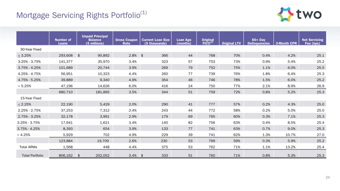 Par Value ($ millions) Market Value ($ millions) Weighted Average CPR(1) % Prepay Protected(2) Amortized Cost Basis ($ millions) Gross Weighted Average Coupon Weighted Average Age (Months) 30-Year Fixed 3.0% $ 225 $ 203 6.3 % 85.6 % $ 200 3.7 % 35 3.5% 62 58 3.4 % 71.8 % 55 4.2 % 33 4.0% 598 577 6.3 % 100.0 % 590 4.6 % 52 4.5% 2,177 2,161 7.0 % 100.0 % 2,225 5.1 % 49 5.0% 1,801 1,814 6.3 % 100.0 % 1,834 5.8 % 30 5.5% 1,170 1,190 5.2 % 99.8 % 1,180 6.4 % 27 6.0% 1,092 1,123 14.0 % 96.0 % 1,116 6.9 % 23 ≥ 6.5% 751 782 7.5 % 100.0 % 773 7.5 % 8 7,876 7,908 7.6 % 98.8 % 7,973 5.9 % 33 Other P&I(3) 561 570 0.1 % — % 558 5.4 % 12 IOs and IIOs(4) 644 36 7.5 % — % 44 5.8 % 190 Total Agency RMBS $ 9,081 $ 8,514 91.8 % $ 8,575 ($ millions) Notional Amount Bond Equivalent Value(5) Through-the-Box Speeds(6) TBA Positions 3.0% $ — $ — 3.7 % 3.5% 66 62 4.0 % 4.0% 230 221 3.3 % 4.5% 1,092 1,073 3.5 % 5.0% 2,401 2,398 3.9 % 5.5% 1,275 1,290 4.5 % 6.0% — — 8.0 % ≥ 6.5% — — 10.7 % Net TBA Position $ 5,064 $ 5,044 22 Agency RMBS Portfolio