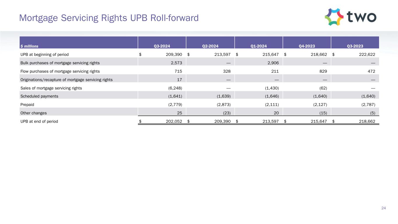 $ millions Q3-2024 Q2-2024 Q1-2024 Q4-2023 Q3-2023 UPB at beginning of period $ 209,390 $ 213,597 $ 215,647 $ 218,662 $ 222,622 Bulk purchases of mortgage servicing rights 2,573 — 2,906 — — Flow purchases of mortgage servicing rights 715 328 211 829 472 Originations/recapture of mortgage servicing rights 17 — — — — Sales of mortgage servicing rights (6,248) — (1,430) (62) — Scheduled payments (1,641) (1,639) (1,646) (1,640) (1,640) Prepaid (2,779) (2,873) (2,111) (2,127) (2,787) Other changes 25 (23) 20 (15) (5) UPB at end of period $ 202,052 $ 209,390 $ 213,597 $ 215,647 $ 218,662 24 Mortgage Servicing Rights UPB Roll-forward
