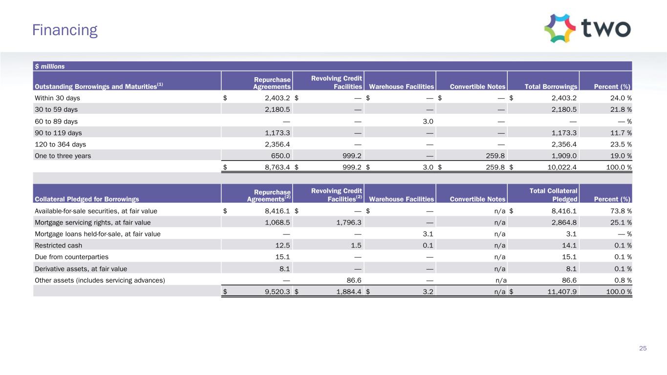 $ millions Outstanding Borrowings and Maturities(1) Repurchase Agreements Revolving Credit Facilities Warehouse Facilities Convertible Notes Total Borrowings Percent (%) Within 30 days $ 2,403.2 $ — $ — $ — $ 2,403.2 24.0 % 30 to 59 days 2,180.5 — — — 2,180.5 21.8 % 60 to 89 days — — 3.0 — — — % 90 to 119 days 1,173.3 — — — 1,173.3 11.7 % 120 to 364 days 2,356.4 — — — 2,356.4 23.5 % One to three years 650.0 999.2 — 259.8 1,909.0 19.0 % $ 8,763.4 $ 999.2 $ 3.0 $ 259.8 $ 10,022.4 100.0 % Collateral Pledged for Borrowings Repurchase Agreements(2) Revolving Credit Facilities(2) Warehouse Facilities Convertible Notes Total Collateral Pledged Percent (%) Available-for-sale securities, at fair value $ 8,416.1 $ — $ — n/a $ 8,416.1 73.8 % Mortgage servicing rights, at fair value 1,068.5 1,796.3 — n/a 2,864.8 25.1 % Mortgage loans held-for-sale, at fair value — — 3.1 n/a 3.1 — % Restricted cash 12.5 1.5 0.1 n/a 14.1 0.1 % Due from counterparties 15.1 — — n/a 15.1 0.1 % Derivative assets, at fair value 8.1 — — n/a 8.1 0.1 % Other assets (includes servicing advances) — 86.6 — n/a 86.6 0.8 % $ 9,520.3 $ 1,884.4 $ 3.2 n/a $ 11,407.9 100.0 % 25 Financing