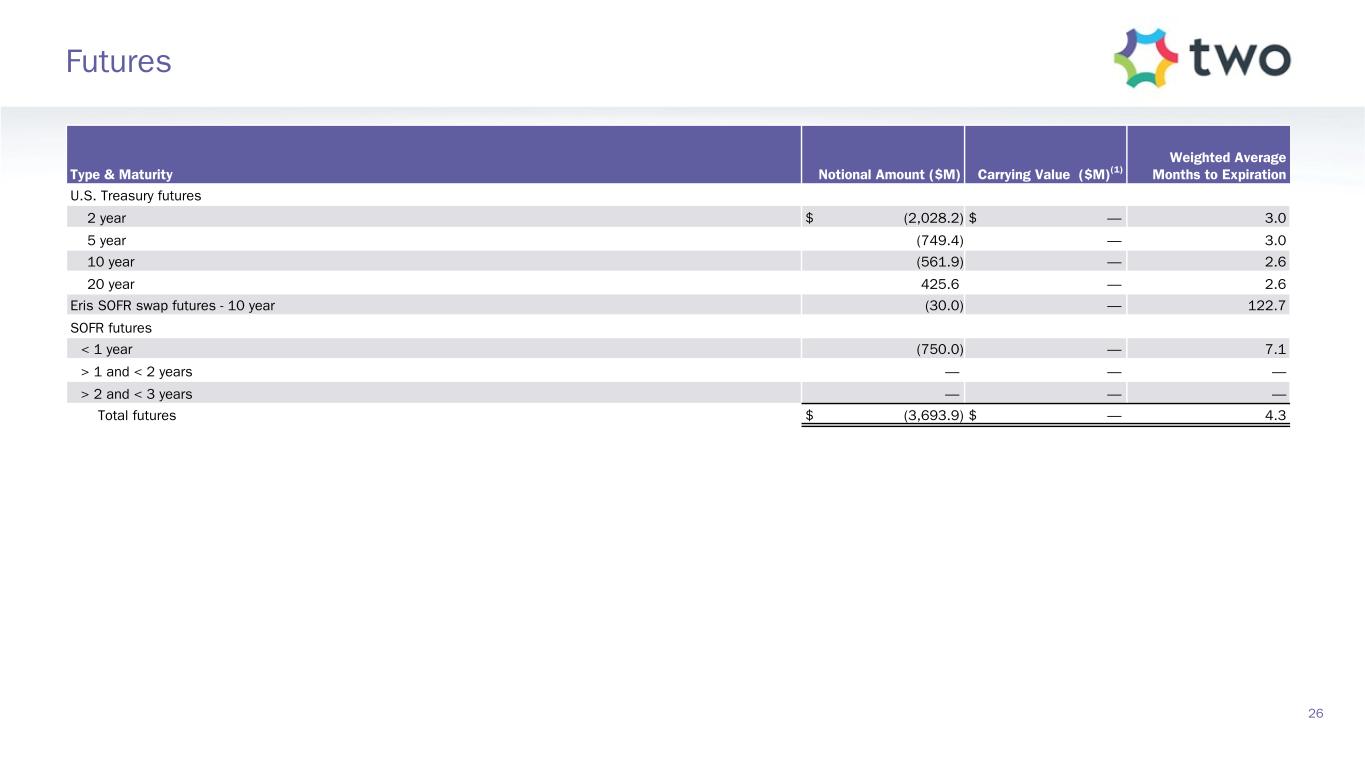 Type & Maturity Notional Amount ($M) Carrying Value ($M)(1) Weighted Average Months to Expiration U.S. Treasury futures 2 year $ (2,028.2) $ — 3.0 5 year (749.4) — 3.0 10 year (561.9) — 2.6 20 year 425.6 — 2.6 Eris SOFR swap futures - 10 year (30.0) — 122.7 SOFR futures < 1 year (750.0) — 7.1 > 1 and < 2 years — — — > 2 and < 3 years — — — Total futures $ (3,693.9) $ — 4.3 26 Futures