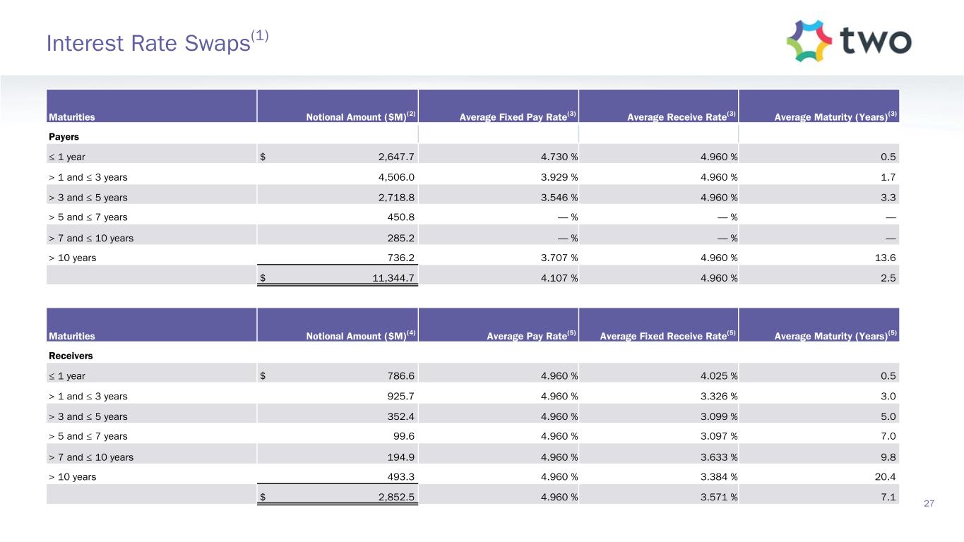 Maturities Notional Amount ($M)(2) Average Fixed Pay Rate(3) Average Receive Rate(3) Average Maturity (Years)(3) Payers ≤ 1 year $ 2,647.7 4.730 % 4.960 % 0.5 > 1 and ≤ 3 years 4,506.0 3.929 % 4.960 % 1.7 > 3 and ≤ 5 years 2,718.8 3.546 % 4.960 % 3.3 > 5 and ≤ 7 years 450.8 — % — % — > 7 and ≤ 10 years 285.2 — % — % — > 10 years 736.2 3.707 % 4.960 % 13.6 $ 11,344.7 4.107 % 4.960 % 2.5 Maturities Notional Amount ($M)(4) Average Pay Rate(5) Average Fixed Receive Rate(5) Average Maturity (Years)(5) Receivers ≤ 1 year $ 786.6 4.960 % 4.025 % 0.5 > 1 and ≤ 3 years 925.7 4.960 % 3.326 % 3.0 > 3 and ≤ 5 years 352.4 4.960 % 3.099 % 5.0 > 5 and ≤ 7 years 99.6 4.960 % 3.097 % 7.0 > 7 and ≤ 10 years 194.9 4.960 % 3.633 % 9.8 > 10 years 493.3 4.960 % 3.384 % 20.4 $ 2,852.5 4.960 % 3.571 % 7.1 27 Interest Rate Swaps(1)
