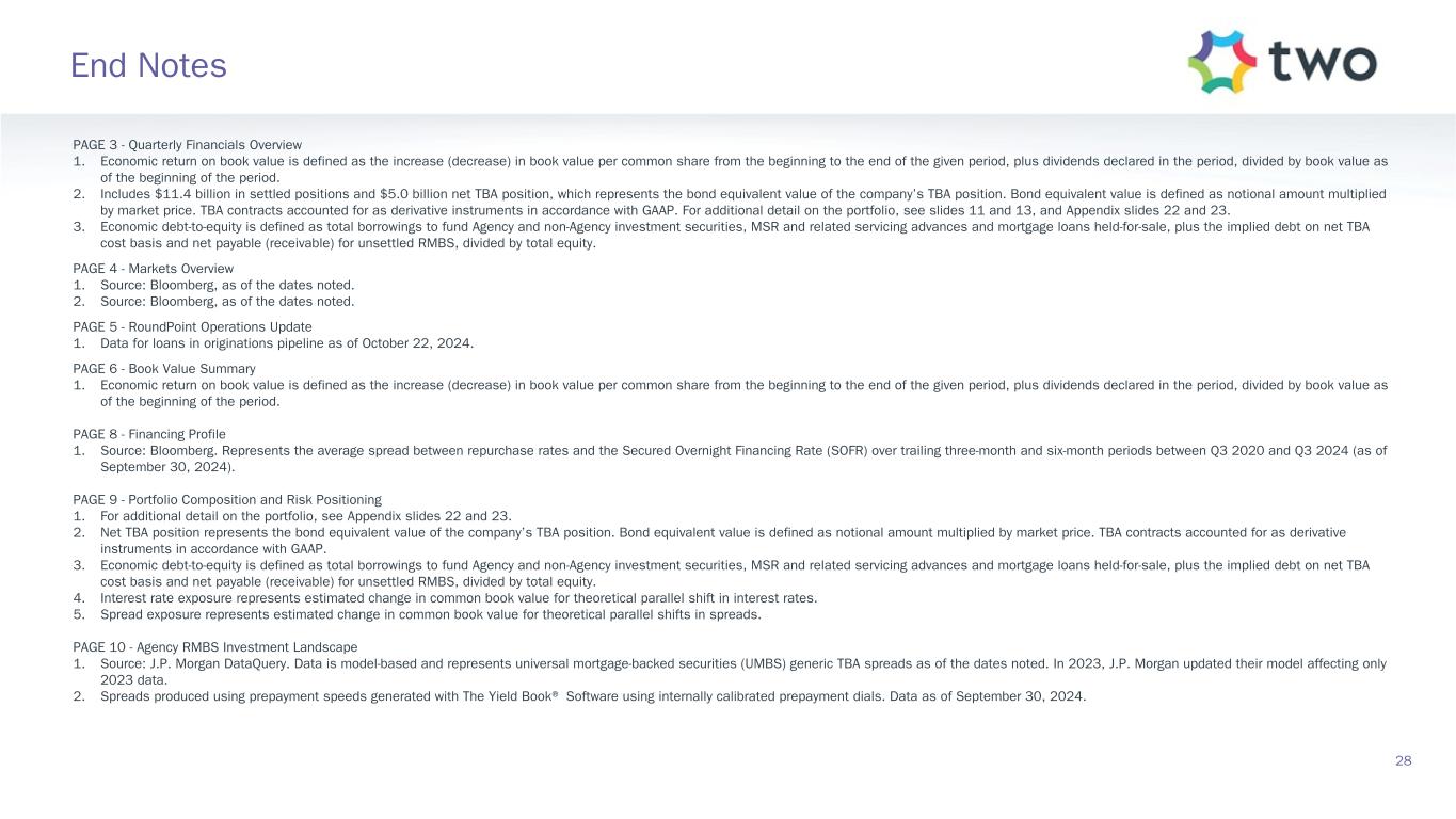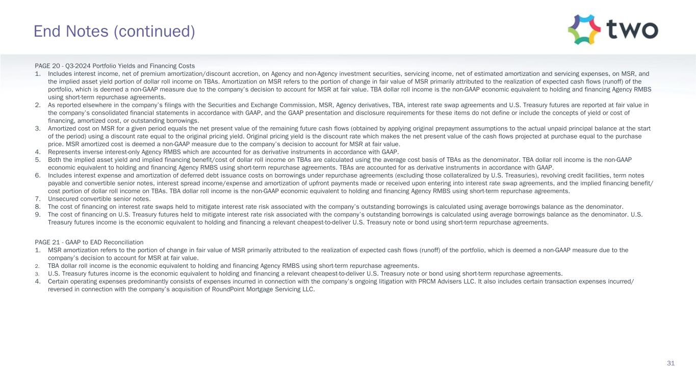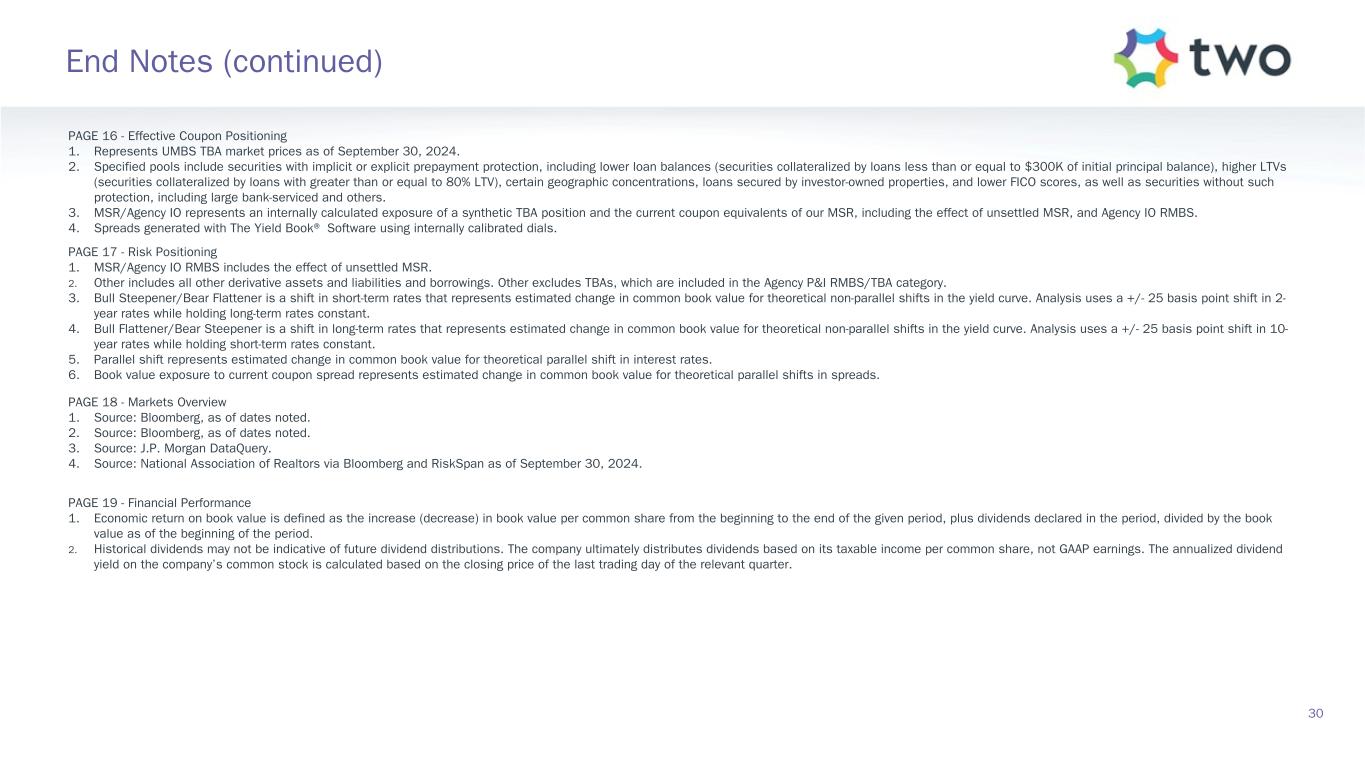PAGE 11 - Agency RMBS Portfolio 1. Specified pools include securities with implicit or explicit prepayment protection, including lower loan balances (securities collateralized by loans less than or equal to $300K of initial principal balance), higher LTVs (securities collateralized by loans with greater than or equal to 80% LTV), certain geographic concentrations, loans secured by investor-owned properties, and lower FICO scores, as well as securities without such protection, including large bank-serviced and others. 2. Represents UMBS generic TBA performance during the quarter. 3. Specified pool performance excludes (1) certain coupons in which we were not invested for the full duration of the quarter and (2) certain coupons with de minimis balances. 4. Specified pool market value by coupon as of September 30, 2024. 5. Three-month prepayment speeds of delivered TBA contracts; average of J.P. Morgan, Bank of America, and Citi data. PAGE 12 - MSR Investment Landscape 1. Sources: RiskSpan Edge aggregation of Fannie Mae and Freddie Mac disclosure data, and TWO’s aggregation of internal data feeds, as well as internal projections. Portfolio metrics represent averages weighted by UPB. Prepayment speed projections generated using internal forecasts for prepayments. The projections are provided for illustration purposes only. 2. Source: RiskSpan. 30-year fixed-rate UMBS UPB as of September 30, 2024 Factor Date; Freddie Mac’s Primary Mortgage Market Survey (PMMS) as of September 30, 2024. PAGE 13 - MSR Portfolio 1. MSR portfolio based on the prior month-end's principal balance of the loans underlying the Company's MSR, increased for current month purchases. Portfolio metrics, other than fair value and UPB, represent averages weighted by UPB. 2. FICO represents a mortgage industry accepted credit score of a borrower. 3. MSR portfolio based on the prior month-end's principal balance of the loans underlying the Company's MSR, increased for current month purchases and excluding unsettled MSR on loans for which the company is the named servicer as well as MSR on loans recently settled for which transfer to the company is not yet complete. 4. Three-month prepayment speeds of delivered TBA contracts; average of J.P. Morgan, Bank of America, and Citi data. PAGE 14 - Return Potential and Outlook 1. Capital allocated represents management’s internal allocation. Certain financing balances and associated interest expenses are allocated between investments based on management’s assessment of leverage ratios and required capital or liquidity to support the investment. 2. Market return estimates reflect static assumptions using quarter-end spreads and market data. 3. Includes Agency pools and TBA positions. Net TBA position represents the bond equivalent value of the company’s TBA position. Bond equivalent value is defined as notional amount multiplied by market price. TBA contracts accounted for as derivative instruments in accordance with GAAP. 4. Estimated return on invested capital reflects static return assumptions using quarter-end portfolio valuations. 5. Total expenses includes operating expenses and tax expenses within the company’s taxable REIT subsidiaries. 6. Preferred equity coupon represents the 5-year yield along the forward curve to account for floating rate resets. 7. Prospective quarterly static return estimate per basic common share reflects portfolio performance expectations given current market conditions and represents the comprehensive income attributable to common stockholders (net of dividends on preferred stock). 29 End Notes (continued)