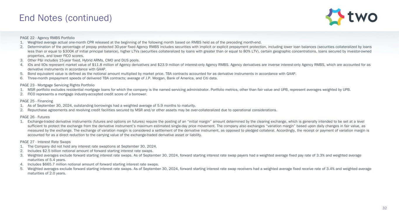 PAGE 20 - Q3-2024 Portfolio Yields and Financing Costs 1. Includes interest income, net of premium amortization/discount accretion, on Agency and non-Agency investment securities, servicing income, net of estimated amortization and servicing expenses, on MSR, and the implied asset yield portion of dollar roll income on TBAs. Amortization on MSR refers to the portion of change in fair value of MSR primarily attributed to the realization of expected cash flows (runoff) of the portfolio, which is deemed a non-GAAP measure due to the company’s decision to account for MSR at fair value. TBA dollar roll income is the non-GAAP economic equivalent to holding and financing Agency RMBS using short-term repurchase agreements. 2. As reported elsewhere in the company’s filings with the Securities and Exchange Commission, MSR, Agency derivatives, TBA, interest rate swap agreements and U.S. Treasury futures are reported at fair value in the company’s consolidated financial statements in accordance with GAAP, and the GAAP presentation and disclosure requirements for these items do not define or include the concepts of yield or cost of financing, amortized cost, or outstanding borrowings. 3. Amortized cost on MSR for a given period equals the net present value of the remaining future cash flows (obtained by applying original prepayment assumptions to the actual unpaid principal balance at the start of the period) using a discount rate equal to the original pricing yield. Original pricing yield is the discount rate which makes the net present value of the cash flows projected at purchase equal to the purchase price. MSR amortized cost is deemed a non-GAAP measure due to the company’s decision to account for MSR at fair value. 4. Represents inverse interest-only Agency RMBS which are accounted for as derivative instruments in accordance with GAAP. 5. Both the implied asset yield and implied financing benefit/cost of dollar roll income on TBAs are calculated using the average cost basis of TBAs as the denominator. TBA dollar roll income is the non-GAAP economic equivalent to holding and financing Agency RMBS using short-term repurchase agreements. TBAs are accounted for as derivative instruments in accordance with GAAP. 6. Includes interest expense and amortization of deferred debt issuance costs on borrowings under repurchase agreements (excluding those collateralized by U.S. Treasuries), revolving credit facilities, term notes payable and convertible senior notes, interest spread income/expense and amortization of upfront payments made or received upon entering into interest rate swap agreements, and the implied financing benefit/ cost portion of dollar roll income on TBAs. TBA dollar roll income is the non-GAAP economic equivalent to holding and financing Agency RMBS using short-term repurchase agreements. 7. Unsecured convertible senior notes. 8. The cost of financing on interest rate swaps held to mitigate interest rate risk associated with the company’s outstanding borrowings is calculated using average borrowings balance as the denominator. 9. The cost of financing on U.S. Treasury futures held to mitigate interest rate risk associated with the company’s outstanding borrowings is calculated using average borrowings balance as the denominator. U.S. Treasury futures income is the economic equivalent to holding and financing a relevant cheapest-to-deliver U.S. Treasury note or bond using short-term repurchase agreements. PAGE 21 - GAAP to EAD Reconciliation 1. MSR amortization refers to the portion of change in fair value of MSR primarily attributed to the realization of expected cash flows (runoff) of the portfolio, which is deemed a non-GAAP measure due to the company’s decision to account for MSR at fair value. 2. TBA dollar roll income is the economic equivalent to holding and financing Agency RMBS using short-term repurchase agreements. 3. U.S. Treasury futures income is the economic equivalent to holding and financing a relevant cheapest-to-deliver U.S. Treasury note or bond using short-term repurchase agreements. 4. Certain operating expenses predominantly consists of expenses incurred in connection with the company’s ongoing litigation with PRCM Advisers LLC. It also includes certain transaction expenses incurred/ reversed in connection with the company’s acquisition of RoundPoint Mortgage Servicing LLC. 31 End Notes (continued)