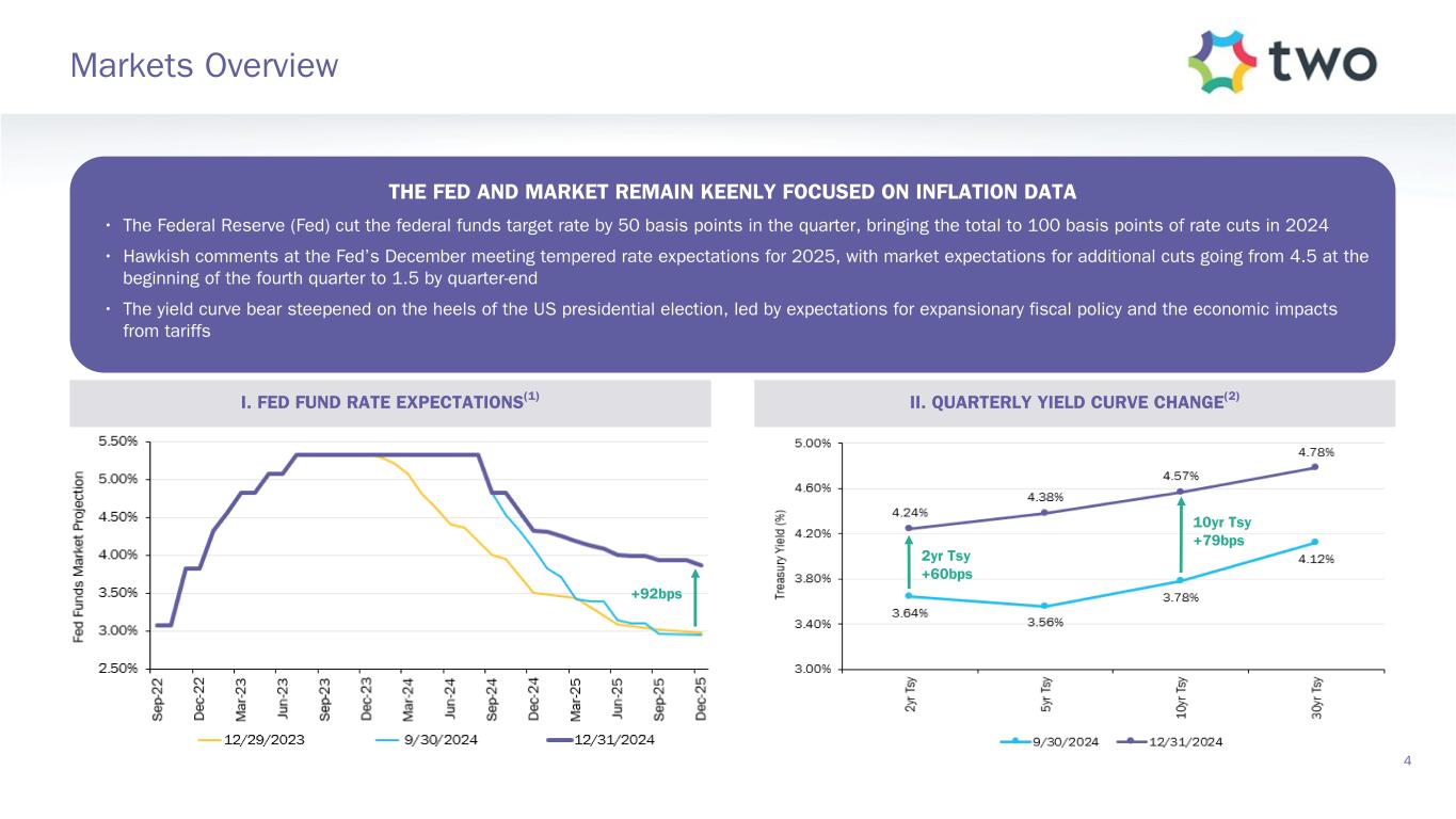 Book Value per Share $14.47 Common Stock Dividend $0.45 Economic Return on Book Value(1) 0.0% Comprehensive Loss per Share $(0.03) Investment Portfolio(2) $14.8b Quarter-End Economic Debt-to-Equity(3) 6.5x Note: Financial data throughout this presentation is as of or for the quarter ended December 31, 2024, unless otherwise noted. Per share metrics utilize basic common shares as the denominator. The End Notes are an integral part of this presentation. See slides 29 through 33 at the back of this presentation for information related to certain financial metrics and defined terms used herein. Quarterly Financials Overview 3