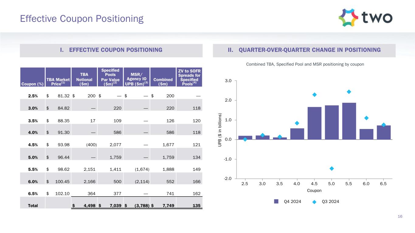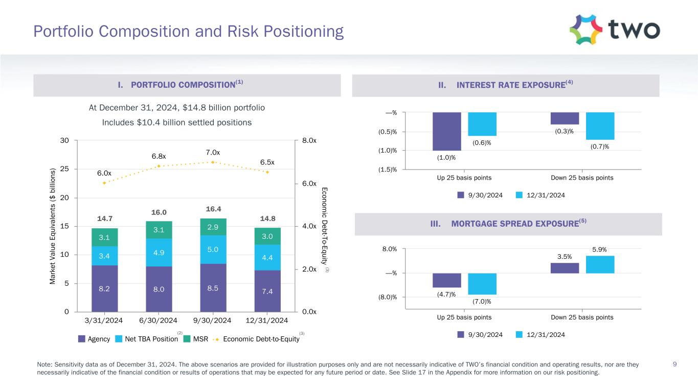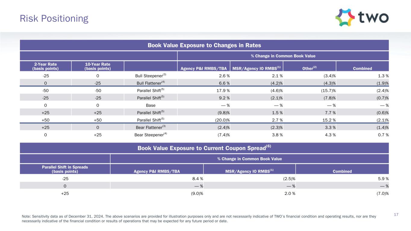 Note: Sensitivity data as of December 31, 2024. The above scenarios are provided for illustration purposes only and are not necessarily indicative of TWO’s financial condition and operating results, nor are they necessarily indicative of the financial condition or results of operations that may be expected for any future period or date. Book Value Exposure to Changes in Rates % Change in Common Book Value 2-Year Rate (basis points) 10-Year Rate (basis points) Agency P&I RMBS/TBA MSR/Agency IO RMBS(1) Other(2) Combined -25 0 Bull Steepener(3) 2.6 % 2.1 % (3.4) % 1.3 % 0 -25 Bull Flattener(4) 6.6 % (4.2) % (4.3) % (1.9) % -50 -50 Parallel Shift(5) 17.9 % (4.6) % (15.7) % (2.4) % -25 -25 Parallel Shift(5) 9.2 % (2.1) % (7.8) % (0.7) % 0 0 Base — % — % — % — % +25 +25 Parallel Shift(5) (9.8) % 1.5 % 7.7 % (0.6) % +50 +50 Parallel Shift(5) (20.0) % 2.7 % 15.2 % (2.1) % +25 0 Bear Flattener(3) (2.4) % (2.3) % 3.3 % (1.4) % 0 +25 Bear Steepener(4) (7.4) % 3.8 % 4.3 % 0.7 % Book Value Exposure to Current Coupon Spread(6) % Change in Common Book Value Parallel Shift in Spreads (basis points) Agency P&I RMBS/TBA MSR/Agency IO RMBS(1) Combined -25 8.4 % (2.5) % 5.9 % 0 — % — % — % +25 (9.0) % 2.0 % (7.0) % 17 Risk Positioning