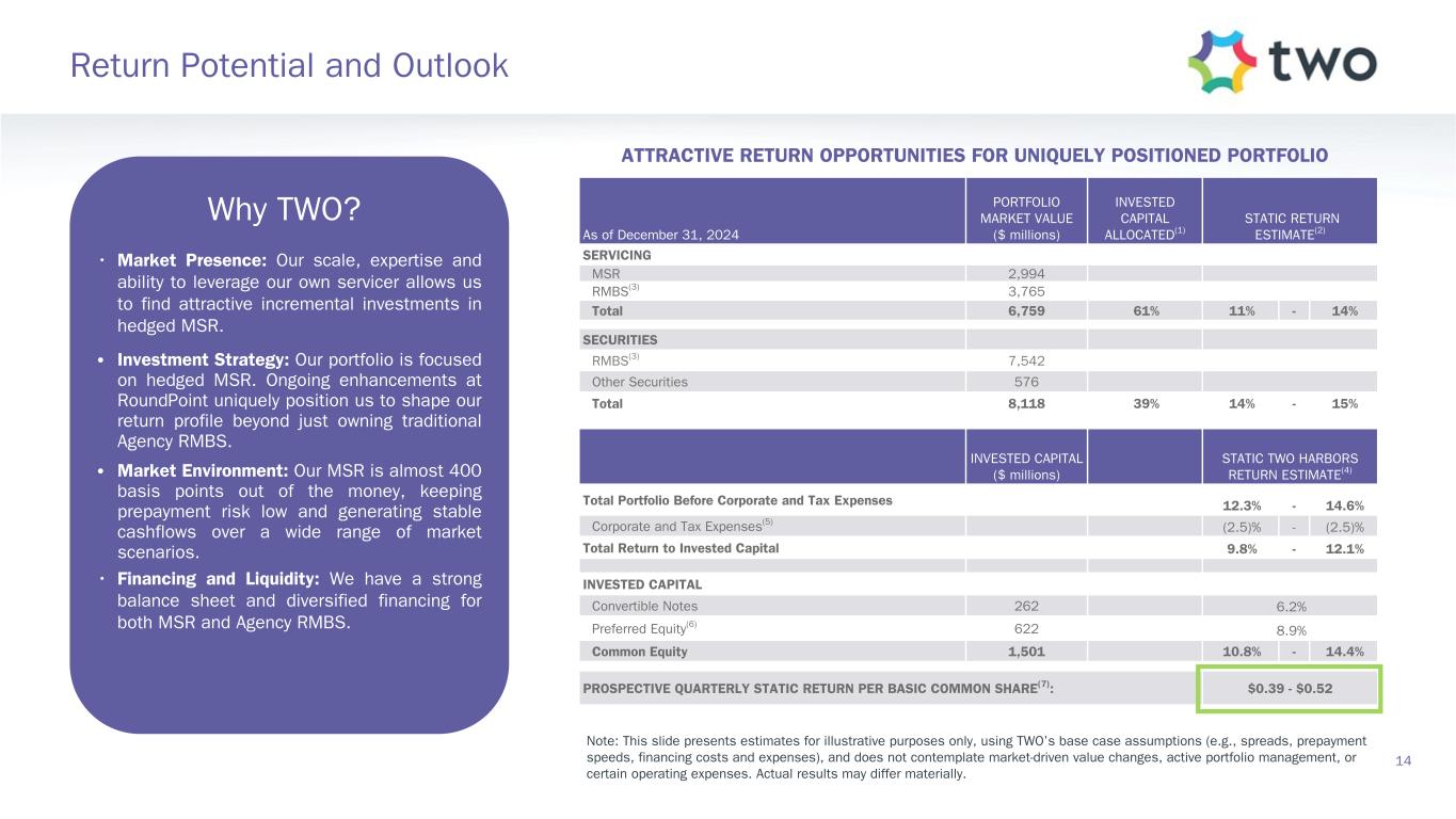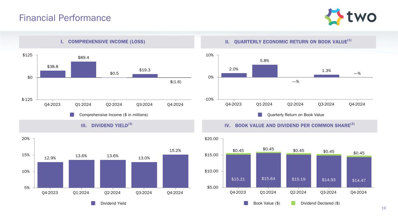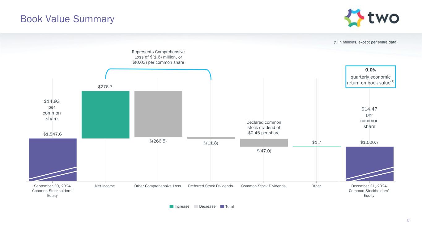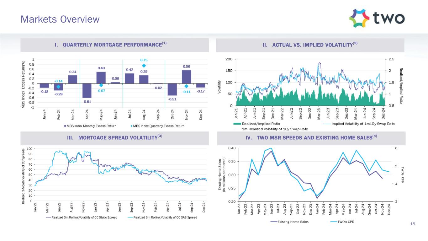 Note: Sensitivity data as of December 31, 2024. The above scenarios are provided for illustration purposes only and are not necessarily indicative of TWO’s financial condition and operating results, nor are they necessarily indicative of the financial condition or results of operations that may be expected for any future period or date. Book Value Exposure to Changes in Rates % Change in Common Book Value 2-Year Rate (basis points) 10-Year Rate (basis points) Agency P&I RMBS/TBA MSR/Agency IO RMBS(1) Other(2) Combined -25 0 Bull Steepener(3) 2.6 % 2.1 % (3.4) % 1.3 % 0 -25 Bull Flattener(4) 6.6 % (4.2) % (4.3) % (1.9) % -50 -50 Parallel Shift(5) 17.9 % (4.6) % (15.7) % (2.4) % -25 -25 Parallel Shift(5) 9.2 % (2.1) % (7.8) % (0.7) % 0 0 Base — % — % — % — % +25 +25 Parallel Shift(5) (9.8) % 1.5 % 7.7 % (0.6) % +50 +50 Parallel Shift(5) (20.0) % 2.7 % 15.2 % (2.1) % +25 0 Bear Flattener(3) (2.4) % (2.3) % 3.3 % (1.4) % 0 +25 Bear Steepener(4) (7.4) % 3.8 % 4.3 % 0.7 % Book Value Exposure to Current Coupon Spread(6) % Change in Common Book Value Parallel Shift in Spreads (basis points) Agency P&I RMBS/TBA MSR/Agency IO RMBS(1) Combined -25 8.4 % (2.5) % 5.9 % 0 — % — % — % +25 (9.0) % 2.0 % (7.0) % 17 Risk Positioning