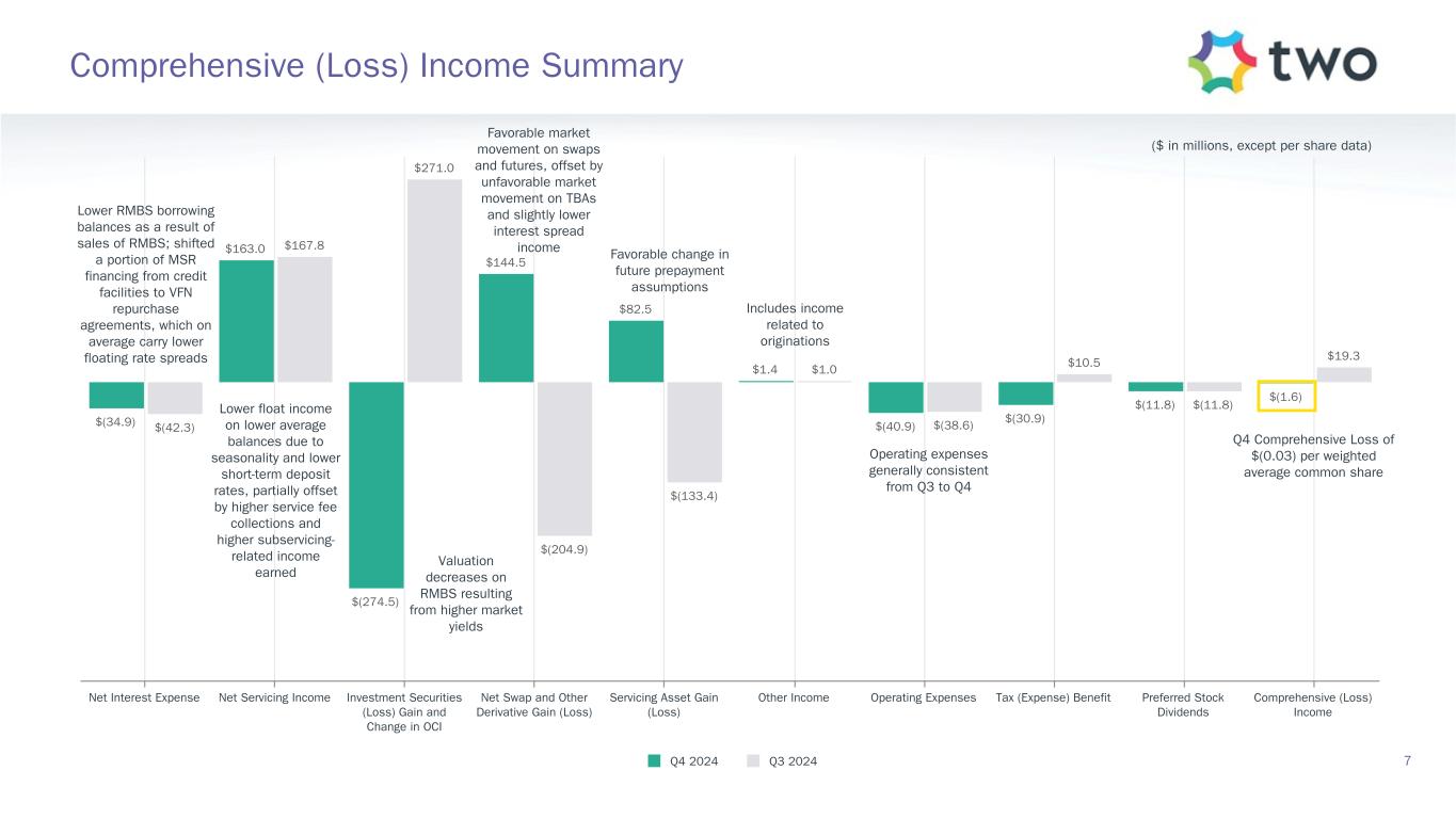 $1,547.6 $276.7 $(266.5) $(11.8) $(47.0) $1.7 $1,500.7 September 30, 2024 Common Stockholders’ Equity Net Income Other Comprehensive Loss Preferred Stock Dividends Common Stock Dividends Other December 31, 2024 Common Stockholders’ Equity ($ in millions, except per share data) $14.93 per common share $14.47 per common share Represents Comprehensive Loss of $(1.6) million, or $(0.03) per common share Declared common stock dividend of $0.45 per share Increase Decrease Total Book Value Summary 6 0.0% quarterly economic return on book value(1)