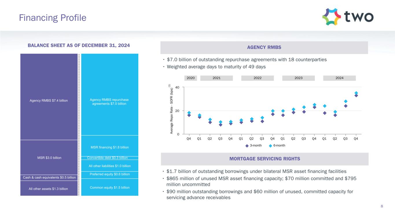 $(34.9) $163.0 $(274.5) $144.5 $82.5 $1.4 $(40.9) $(30.9) $(11.8) $(1.6) $(42.3) $167.8 $271.0 $(204.9) $(133.4) $1.0 $(38.6) $10.5 $(11.8) $19.3 Q4 2024 Q3 2024 Net Interest Expense Net Servicing Income Investment Securities (Loss) Gain and Change in OCI Net Swap and Other Derivative Gain (Loss) Servicing Asset Gain (Loss) Other Income Operating Expenses Tax (Expense) Benefit Preferred Stock Dividends Comprehensive (Loss) Income Q4 Comprehensive Loss of $(0.03) per weighted average common share Lower float income on lower average balances due to seasonality and lower short-term deposit rates, partially offset by higher service fee collections and higher subservicing- related income earned Lower RMBS borrowing balances as a result of sales of RMBS; shifted a portion of MSR financing from credit facilities to VFN repurchase agreements, which on average carry lower floating rate spreads Valuation decreases on RMBS resulting from higher market yields Favorable change in future prepayment assumptions Favorable market movement on swaps and futures, offset by unfavorable market movement on TBAs and slightly lower interest spread income Operating expenses generally consistent from Q3 to Q4 Comprehensive (Loss) Income Summary 7 Includes income related to originations ($ in millions, except per share data)