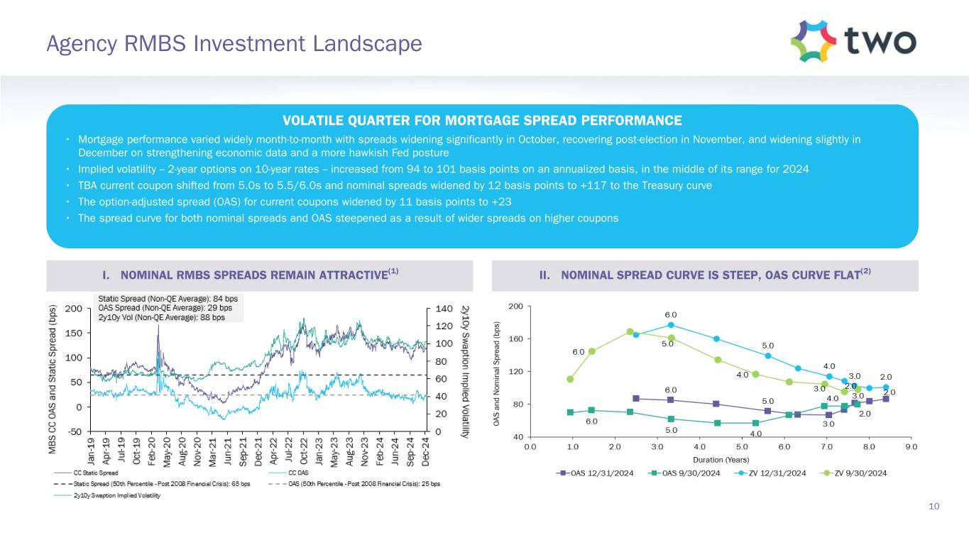 At December 31, 2024, $14.8 billion portfolio Includes $10.4 billion settled positions M ar ke t Va lu e Eq ui va le nt s ($ b ill io ns ) Econom ic D ebt-To-Equity 8.2 8.0 8.5 7.4 3.4 4.9 5.0 4.4 3.1 3.1 2.9 3.0 6.0x 6.8x 7.0x 6.5x Agency Net TBA Position MSR Economic Debt-to-Equity 3/31/2024 6/30/2024 9/30/2024 12/31/2024 0 5 10 15 20 25 30 0.0x 2.0x 4.0x 6.0x 8.0x (3) (3 ) (2) 14.8 16.4 14.7 16.0 Note: Sensitivity data as of December 31, 2024. The above scenarios are provided for illustration purposes only and are not necessarily indicative of TWO’s financial condition and operating results, nor are they necessarily indicative of the financial condition or results of operations that may be expected for any future period or date. See Slide 17 in the Appendix for more information on our risk positioning. (1.0)% (0.3)% (0.6)% (0.7)% 9/30/2024 12/31/2024 Up 25 basis points Down 25 basis points (1.5)% (1.0)% (0.5)% —% (4.7)% 3.5% (7.0)% 5.9% 9/30/2024 12/31/2024 Up 25 basis points Down 25 basis points (8.0)% —% 8.0% 9 Portfolio Composition and Risk Positioning I. PORTFOLIO COMPOSITION(1) II. INTEREST RATE EXPOSURE(4) III. MORTGAGE SPREAD EXPOSURE(5)