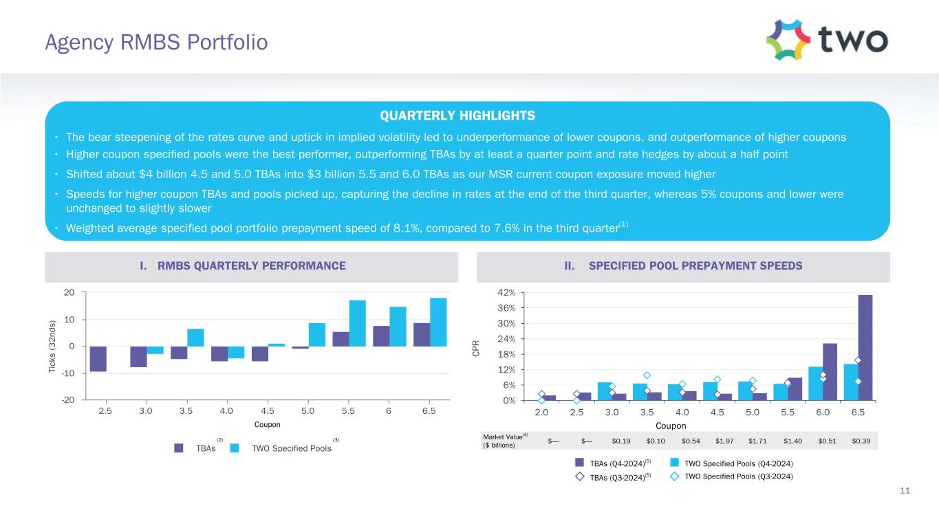 10 Agency RMBS Investment Landscape VOLATILE QUARTER FOR MORTGAGE SPREAD PERFORMANCE • Mortgage performance varied widely month-to-month with spreads widening significantly in October, recovering post-election in November, and widening slightly in December on strengthening economic data and a more hawkish Fed posture • Implied volatility -- 2-year options on 10-year rates -- increased from 94 to 101 basis points on an annualized basis, in the middle of its range for 2024 • TBA current coupon shifted from 5.0s to 5.5/6.0s and nominal spreads widened by 12 basis points to +117 to the Treasury curve • The option-adjusted spread (OAS) for current coupons widened by 11 basis points to +23 • The spread curve for both nominal spreads and OAS steepened as a result of wider spreads on higher coupons I. NOMINAL RMBS SPREADS REMAIN ATTRACTIVE(1) II. NOMINAL SPREAD CURVE IS STEEP, OAS CURVE FLAT(2)
