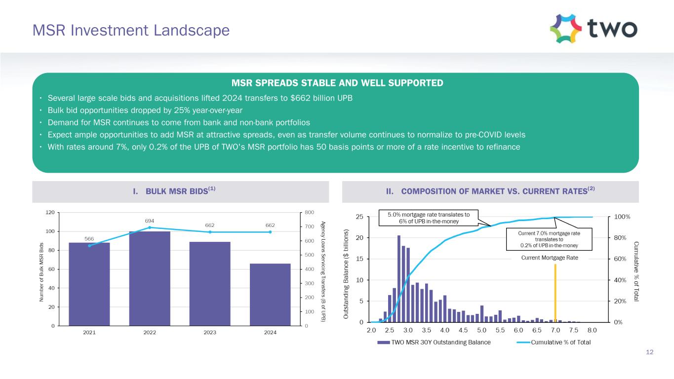 Coupon Ti ck s (3 2 nd s) TBAs TWO Specified Pools 2.5 3.0 3.5 4.0 4.5 5.0 5.5 6 6.5 -20 -10 0 10 20 TWO Specified Pools (Q4-2024)TBAs (Q4-2024)(5) TBAs (Q3-2024)(5) TWO Specified Pools (Q3-2024) Market Value(4) ($ billions) $— $— $0.19 $0.10 $0.54 $1.97 $1.71 $1.40 $0.51 $0.39 11 Agency RMBS Portfolio I. RMBS QUARTERLY PERFORMANCE II. SPECIFIED POOL PREPAYMENT SPEEDS (2) (3) QUARTERLY HIGHLIGHTS • The bear steepening of the rates curve and uptick in implied volatility led to underperformance of lower coupons, and outperformance of higher coupons • Higher coupon specified pools were the best performer, outperforming TBAs by at least a quarter point and rate hedges by about a half point • Shifted about $4 billion 4.5 and 5.0 TBAs into $3 billion 5.5 and 6.0 TBAs as our MSR current coupon exposure moved higher • Speeds for higher coupon TBAs and pools picked up, capturing the decline in rates at the end of the third quarter, whereas 5% coupons and lower were unchanged to slightly slower • Weighted average specified pool portfolio prepayment speed of 8.1%, compared to 7.6% in the third quarter(1)