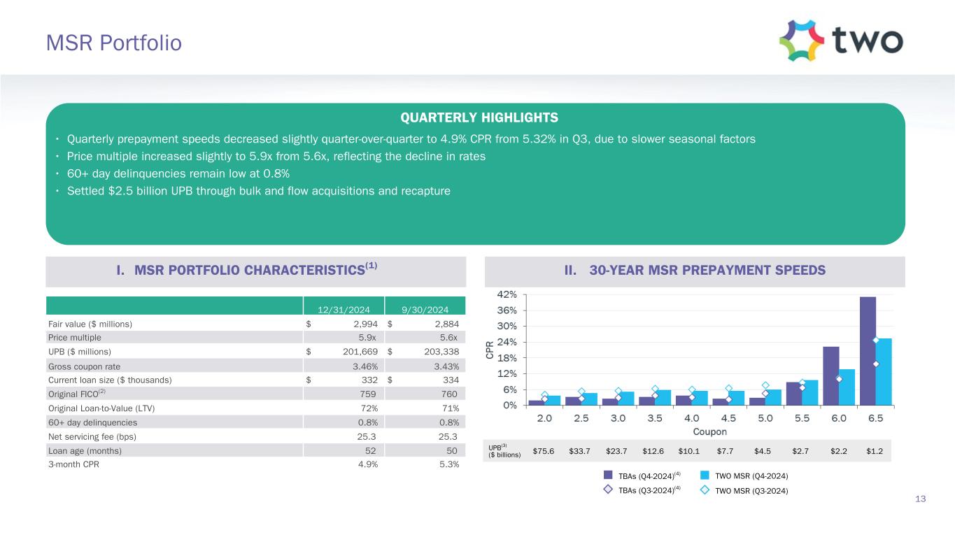 12 MSR Investment Landscape MSR SPREADS STABLE AND WELL SUPPORTED • Several large scale bids and acquisitions lifted 2024 transfers to $662 billion UPB • Bulk bid opportunities dropped by 25% year-over-year • Demand for MSR continues to come from bank and non-bank portfolios • Expect ample opportunities to add MSR at attractive spreads, even as transfer volume continues to normalize to pre-COVID levels • With rates around 7%, only 0.2% of the UPB of TWO's MSR portfolio has 50 basis points or more of a rate incentive to refinance I. BULK MSR BIDS(1) II. COMPOSITION OF MARKET VS. CURRENT RATES(2)