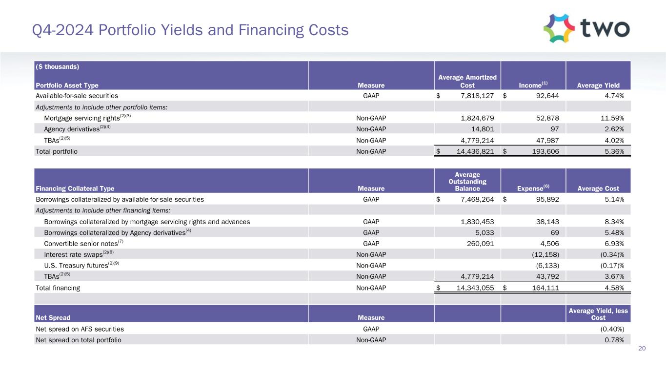 ($ thousands) Portfolio Asset Type Measure Average Amortized Cost Income(1) Average Yield Available-for-sale securities GAAP $ 7,818,127 $ 92,644 4.74% Adjustments to include other portfolio items: Mortgage servicing rights(2)(3) Non-GAAP 1,824,679 52,878 11.59% Agency derivatives(2)(4) Non-GAAP 14,801 97 2.62 % TBAs(2)(5) Non-GAAP 4,779,214 47,987 4.02 % Total portfolio Non-GAAP $ 14,436,821 $ 193,606 5.36% Financing Collateral Type Measure Average Outstanding Balance Expense(6) Average Cost Borrowings collateralized by available-for-sale securities GAAP $ 7,468,264 $ 95,892 5.14% Adjustments to include other financing items: Borrowings collateralized by mortgage servicing rights and advances GAAP 1,830,453 38,143 8.34 % Borrowings collateralized by Agency derivatives(4) GAAP 5,033 69 5.48 % Convertible senior notes(7) GAAP 260,091 4,506 6.93 % Interest rate swaps(2)(8) Non-GAAP (12,158) (0.34) % U.S. Treasury futures(2)(9) Non-GAAP (6,133) (0.17) % TBAs(2)(5) Non-GAAP 4,779,214 43,792 3.67 % Total financing Non-GAAP $ 14,343,055 $ 164,111 4.58 % Net Spread Measure Average Yield, less Cost Net spread on AFS securities GAAP (0.40%) Net spread on total portfolio Non-GAAP 0.78% 20 Q4-2024 Portfolio Yields and Financing Costs