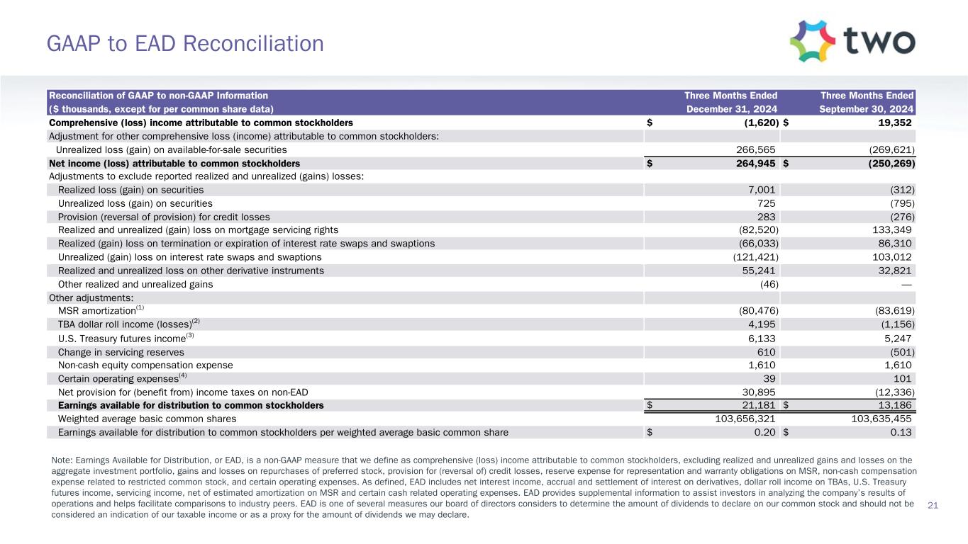 Reconciliation of GAAP to non-GAAP Information Three Months Ended Three Months Ended ($ thousands, except for per common share data) December 31, 2024 September 30, 2024 Comprehensive (loss) income attributable to common stockholders $ (1,620) $ 19,352 Adjustment for other comprehensive loss (income) attributable to common stockholders: Unrealized loss (gain) on available-for-sale securities 266,565 (269,621) Net income (loss) attributable to common stockholders $ 264,945 $ (250,269) Adjustments to exclude reported realized and unrealized (gains) losses: Realized loss (gain) on securities 7,001 (312) Unrealized loss (gain) on securities 725 (795) Provision (reversal of provision) for credit losses 283 (276) Realized and unrealized (gain) loss on mortgage servicing rights (82,520) 133,349 Realized (gain) loss on termination or expiration of interest rate swaps and swaptions (66,033) 86,310 Unrealized (gain) loss on interest rate swaps and swaptions (121,421) 103,012 Realized and unrealized loss on other derivative instruments 55,241 32,821 Other realized and unrealized gains (46) — Other adjustments: MSR amortization(1) (80,476) (83,619) TBA dollar roll income (losses)(2) 4,195 (1,156) U.S. Treasury futures income(3) 6,133 5,247 Change in servicing reserves 610 (501) Non-cash equity compensation expense 1,610 1,610 Certain operating expenses(4) 39 101 Net provision for (benefit from) income taxes on non-EAD 30,895 (12,336) Earnings available for distribution to common stockholders $ 21,181 $ 13,186 Weighted average basic common shares 103,656,321 103,635,455 Earnings available for distribution to common stockholders per weighted average basic common share $ 0.20 $ 0.13 Note: Earnings Available for Distribution, or EAD, is a non-GAAP measure that we define as comprehensive (loss) income attributable to common stockholders, excluding realized and unrealized gains and losses on the aggregate investment portfolio, gains and losses on repurchases of preferred stock, provision for (reversal of) credit losses, reserve expense for representation and warranty obligations on MSR, non-cash compensation expense related to restricted common stock, and certain operating expenses. As defined, EAD includes net interest income, accrual and settlement of interest on derivatives, dollar roll income on TBAs, U.S. Treasury futures income, servicing income, net of estimated amortization on MSR and certain cash related operating expenses. EAD provides supplemental information to assist investors in analyzing the company’s results of operations and helps facilitate comparisons to industry peers. EAD is one of several measures our board of directors considers to determine the amount of dividends to declare on our common stock and should not be considered an indication of our taxable income or as a proxy for the amount of dividends we may declare. 21 GAAP to EAD Reconciliation
