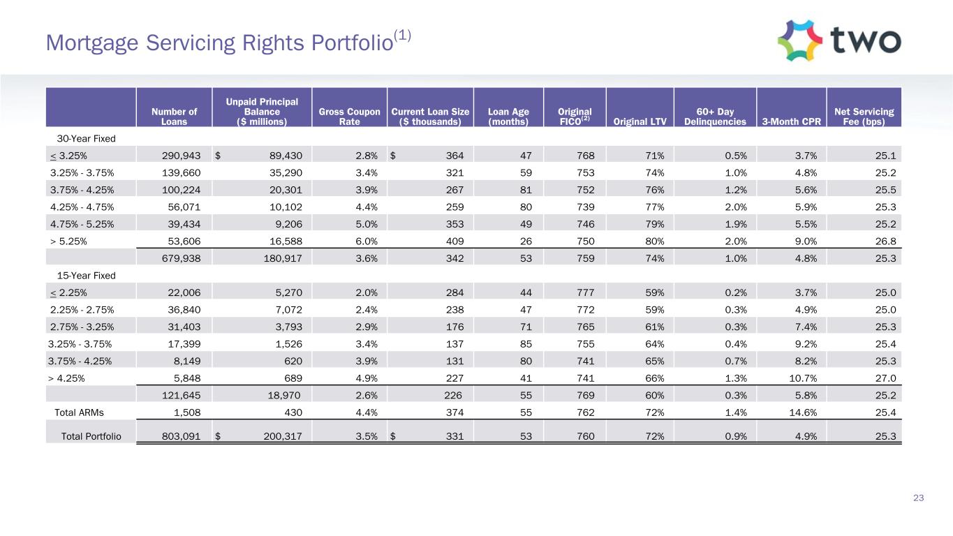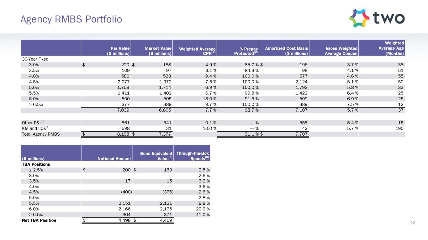 Par Value ($ millions) Market Value ($ millions) Weighted Average CPR(1) % Prepay Protected(2) Amortized Cost Basis ($ millions) Gross Weighted Average Coupon Weighted Average Age (Months) 30-Year Fixed 3.0% $ 220 $ 188 4.9 % 85.7 % $ 196 3.7 % 38 3.5% 109 97 3.1 % 84.3 % 98 4.1 % 51 4.0% 586 538 9.4 % 100.0 % 577 4.6 % 55 4.5% 2,077 1,972 7.5 % 100.0 % 2,124 5.1 % 52 5.0% 1,759 1,714 6.9 % 100.0 % 1,792 5.8 % 33 5.5% 1,411 1,402 6.7 % 99.8 % 1,422 6.4 % 25 6.0% 500 505 13.0 % 91.5 % 509 6.9 % 25 ≥ 6.5% 377 389 9.7 % 100.0 % 389 7.5 % 12 7,039 6,805 7.7 % 98.7 % 7,107 5.7 % 37 Other P&I(3) 561 541 0.1 % — % 558 5.4 % 15 IOs and IIOs(4) 598 31 10.0 % — % 42 5.7 % 190 Total Agency RMBS $ 8,198 $ 7,377 91.1 % $ 7,707 ($ millions) Notional Amount Bond Equivalent Value(5) Through-the-Box Speeds(6) TBA Positions ≤ 2.5% $ 200 $ 163 2.5 % 3.0% — — 2.6 % 3.5% 17 15 3.2 % 4.0% — — 3.6 % 4.5% (400) (376) 2.6 % 5.0% — — 2.8 % 5.5% 2,151 2,121 8.8 % 6.0% 2,166 2,175 22.2 % ≥ 6.5% 364 371 41.0 % Net TBA Position $ 4,498 $ 4,469 22 Agency RMBS Portfolio