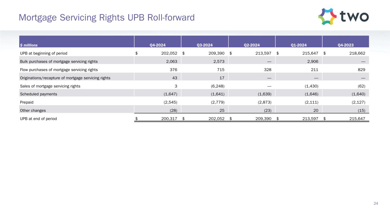 $ millions Q4-2024 Q3-2024 Q2-2024 Q1-2024 Q4-2023 UPB at beginning of period $ 202,052 $ 209,390 $ 213,597 $ 215,647 $ 218,662 Bulk purchases of mortgage servicing rights 2,063 2,573 — 2,906 — Flow purchases of mortgage servicing rights 376 715 328 211 829 Originations/recapture of mortgage servicing rights 43 17 — — — Sales of mortgage servicing rights 3 (6,248) — (1,430) (62) Scheduled payments (1,647) (1,641) (1,639) (1,646) (1,640) Prepaid (2,545) (2,779) (2,873) (2,111) (2,127) Other changes (28) 25 (23) 20 (15) UPB at end of period $ 200,317 $ 202,052 $ 209,390 $ 213,597 $ 215,647 24 Mortgage Servicing Rights UPB Roll-forward