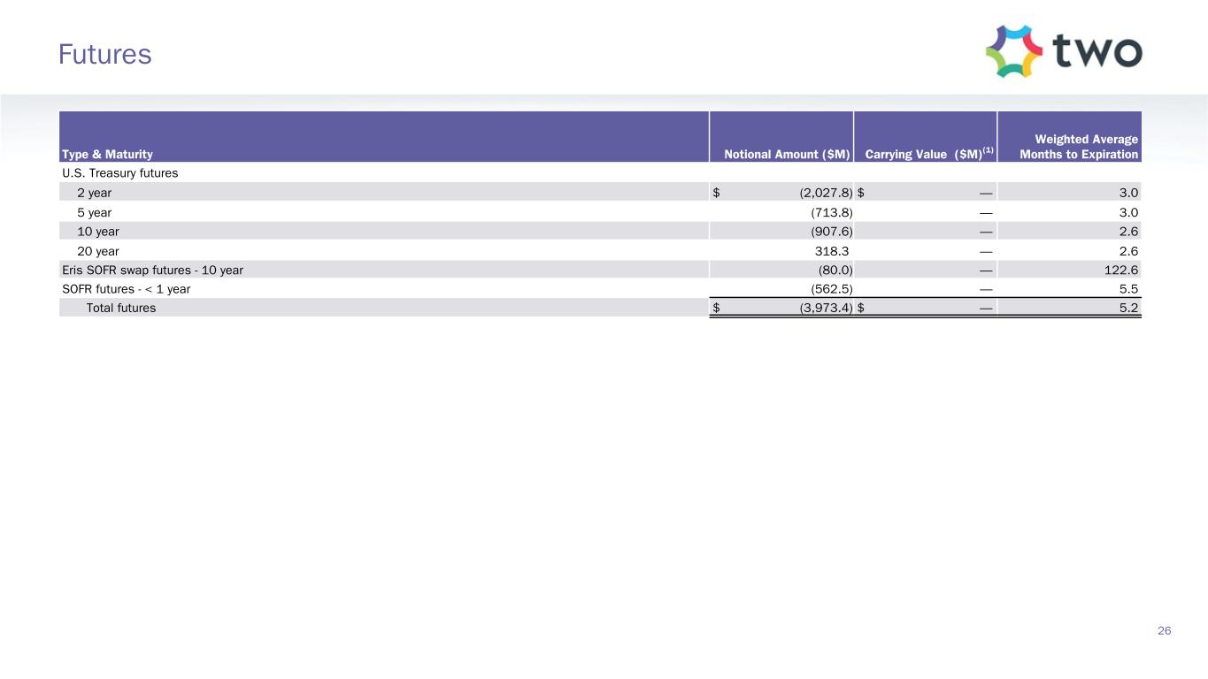 Type & Maturity Notional Amount ($M) Carrying Value ($M)(1) Weighted Average Months to Expiration U.S. Treasury futures 2 year $ (2,027.8) $ — 3.0 5 year (713.8) — 3.0 10 year (907.6) — 2.6 20 year 318.3 — 2.6 Eris SOFR swap futures - 10 year (80.0) — 122.6 SOFR futures - < 1 year (562.5) — 5.5 Total futures $ (3,973.4) $ — 5.2 26 Futures