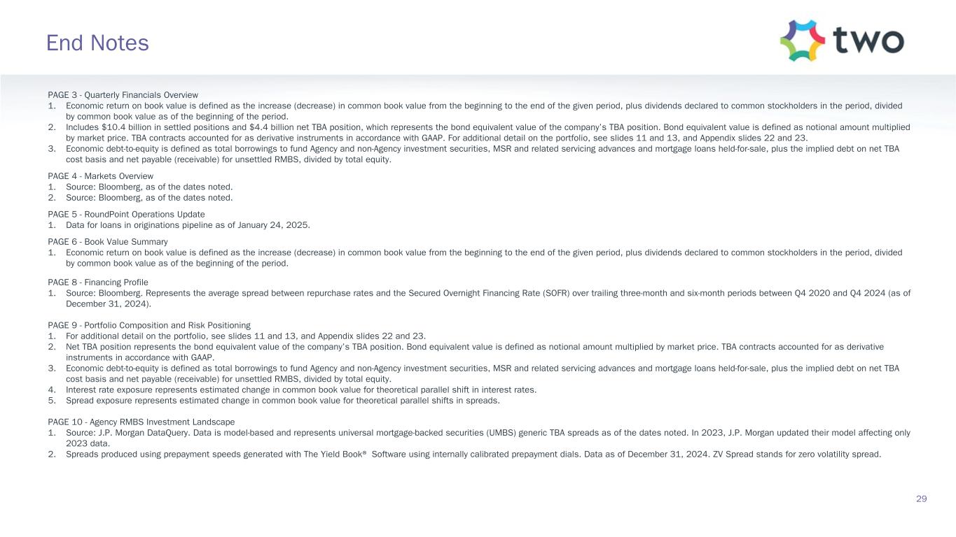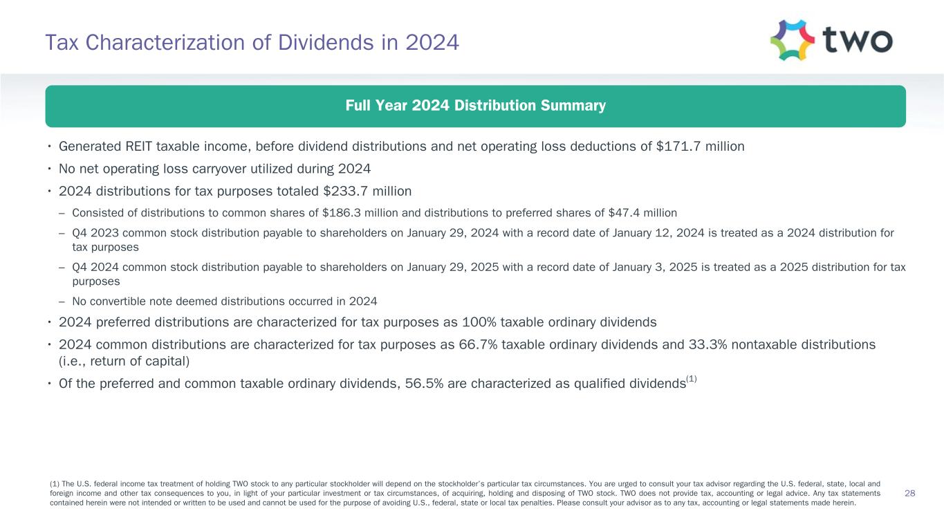 28 Tax Characterization of Dividends in 2024 (1) The U.S. federal income tax treatment of holding TWO stock to any particular stockholder will depend on the stockholder’s particular tax circumstances. You are urged to consult your tax advisor regarding the U.S. federal, state, local and foreign income and other tax consequences to you, in light of your particular investment or tax circumstances, of acquiring, holding and disposing of TWO stock. TWO does not provide tax, accounting or legal advice. Any tax statements contained herein were not intended or written to be used and cannot be used for the purpose of avoiding U.S., federal, state or local tax penalties. Please consult your advisor as to any tax, accounting or legal statements made herein. Full Year 2024 Distribution Summary • Generated REIT taxable income, before dividend distributions and net operating loss deductions of $171.7 million • No net operating loss carryover utilized during 2024 • 2024 distributions for tax purposes totaled $233.7 million – Consisted of distributions to common shares of $186.3 million and distributions to preferred shares of $47.4 million – Q4 2023 common stock distribution payable to shareholders on January 29, 2024 with a record date of January 12, 2024 is treated as a 2024 distribution for tax purposes – Q4 2024 common stock distribution payable to shareholders on January 29, 2025 with a record date of January 3, 2025 is treated as a 2025 distribution for tax purposes – No convertible note deemed distributions occurred in 2024 • 2024 preferred distributions are characterized for tax purposes as 100% taxable ordinary dividends • 2024 common distributions are characterized for tax purposes as 66.7% taxable ordinary dividends and 33.3% nontaxable distributions (i.e., return of capital) • Of the preferred and common taxable ordinary dividends, 56.5% are characterized as qualified dividends(1)