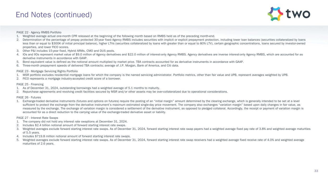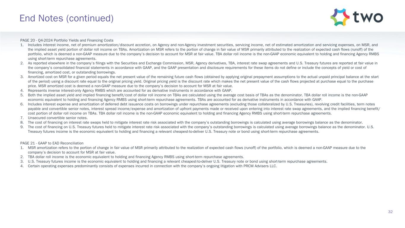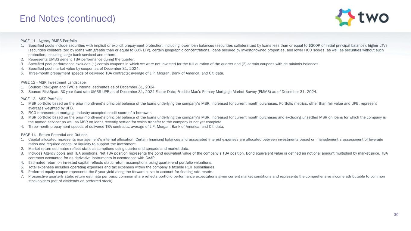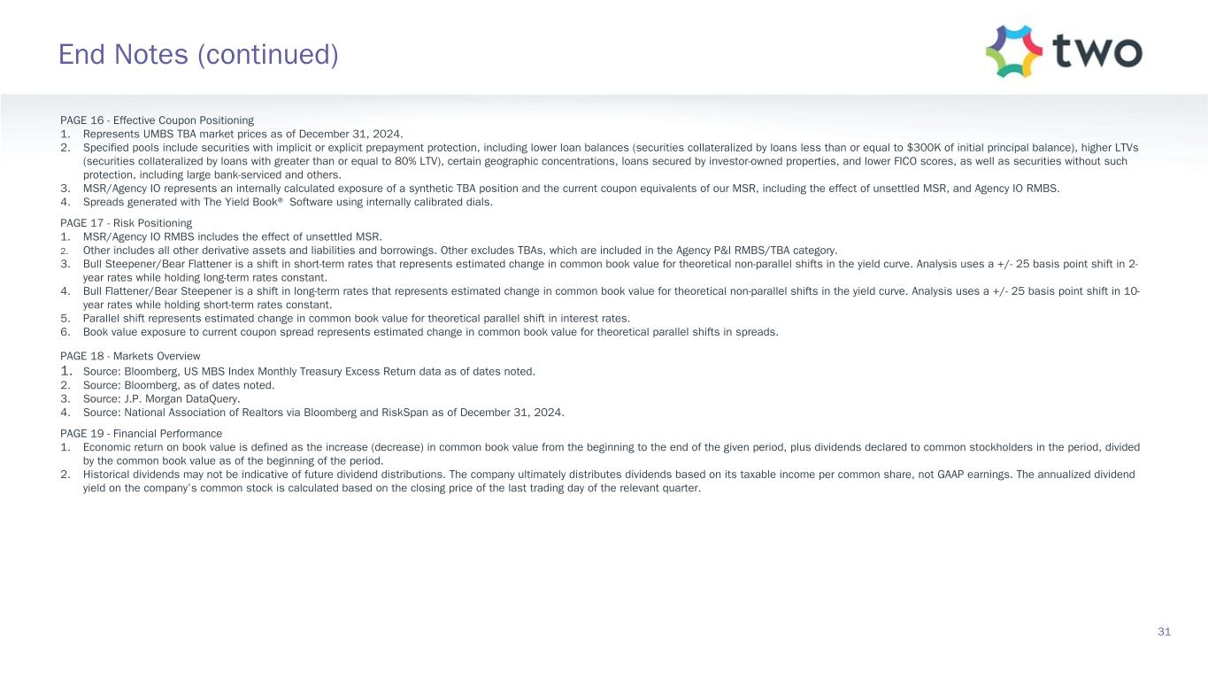 PAGE 11 - Agency RMBS Portfolio 1. Specified pools include securities with implicit or explicit prepayment protection, including lower loan balances (securities collateralized by loans less than or equal to $300K of initial principal balance), higher LTVs (securities collateralized by loans with greater than or equal to 80% LTV), certain geographic concentrations, loans secured by investor-owned properties, and lower FICO scores, as well as securities without such protection, including large bank-serviced and others. 2. Represents UMBS generic TBA performance during the quarter. 3. Specified pool performance excludes (1) certain coupons in which we were not invested for the full duration of the quarter and (2) certain coupons with de minimis balances. 4. Specified pool market value by coupon as of December 31, 2024. 5. Three-month prepayment speeds of delivered TBA contracts; average of J.P. Morgan, Bank of America, and Citi data. PAGE 12 - MSR Investment Landscape 1. Source: RiskSpan and TWO’s internal estimates as of December 31, 2024. 2. Source: RiskSpan. 30-year fixed-rate UMBS UPB as of December 31, 2024 Factor Date; Freddie Mac’s Primary Mortgage Market Survey (PMMS) as of December 31, 2024. PAGE 13 - MSR Portfolio 1. MSR portfolio based on the prior month-end's principal balance of the loans underlying the company's MSR, increased for current month purchases. Portfolio metrics, other than fair value and UPB, represent averages weighted by UPB. 2. FICO represents a mortgage industry accepted credit score of a borrower. 3. MSR portfolio based on the prior month-end's principal balance of the loans underlying the company's MSR, increased for current month purchases and excluding unsettled MSR on loans for which the company is the named servicer as well as MSR on loans recently settled for which transfer to the company is not yet complete. 4. Three-month prepayment speeds of delivered TBA contracts; average of J.P. Morgan, Bank of America, and Citi data. PAGE 14 - Return Potential and Outlook 1. Capital allocated represents management’s internal allocation. Certain financing balances and associated interest expenses are allocated between investments based on management’s assessment of leverage ratios and required capital or liquidity to support the investment. 2. Market return estimates reflect static assumptions using quarter-end spreads and market data. 3. Includes Agency pools and TBA positions. Net TBA position represents the bond equivalent value of the company’s TBA position. Bond equivalent value is defined as notional amount multiplied by market price. TBA contracts accounted for as derivative instruments in accordance with GAAP. 4. Estimated return on invested capital reflects static return assumptions using quarter-end portfolio valuations. 5. Total expenses includes operating expenses and tax expenses within the company’s taxable REIT subsidiaries. 6. Preferred equity coupon represents the 5-year yield along the forward curve to account for floating rate resets. 7. Prospective quarterly static return estimate per basic common share reflects portfolio performance expectations given current market conditions and represents the comprehensive income attributable to common stockholders (net of dividends on preferred stock). 30 End Notes (continued)