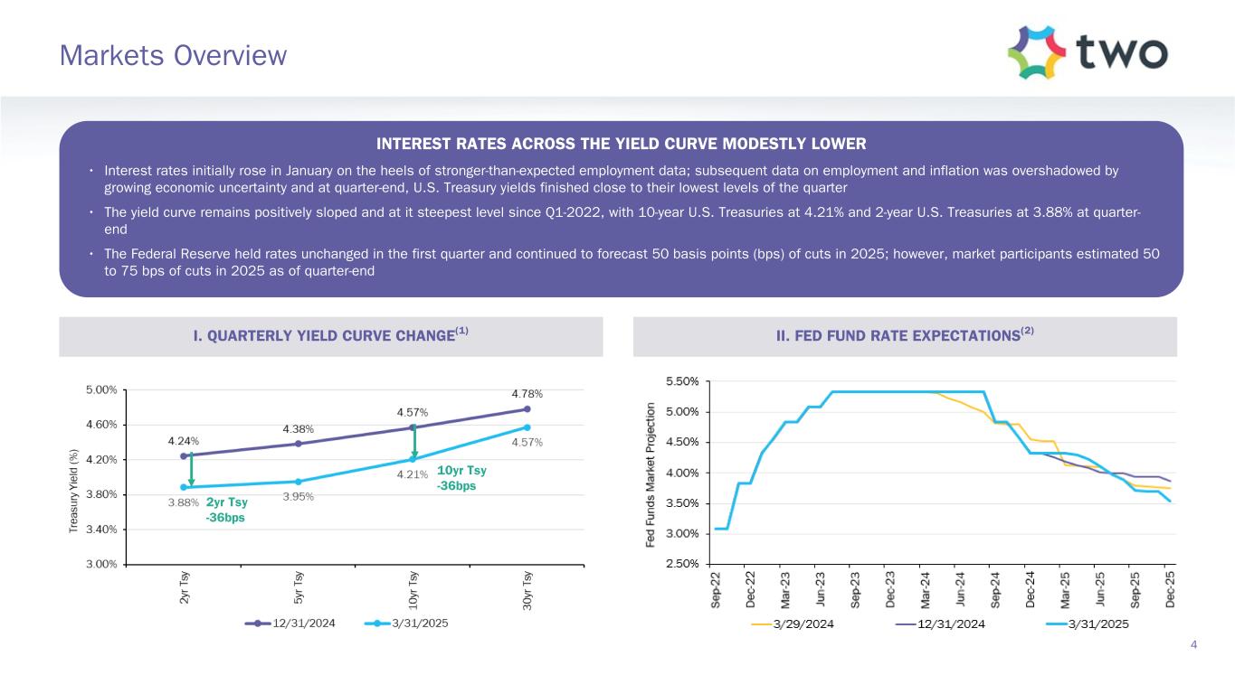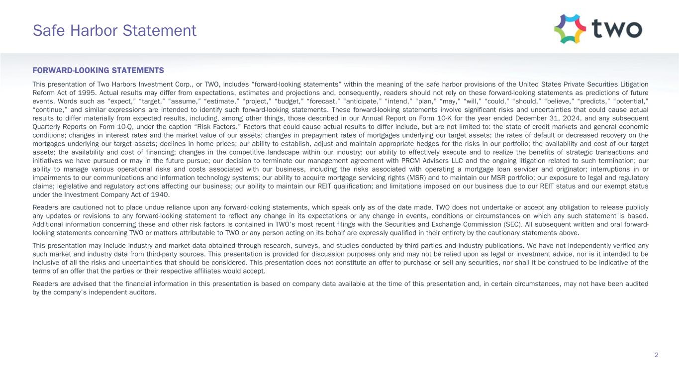 Safe Harbor Statement 2 FORWARD-LOOKING STATEMENTS This presentation of Two Harbors Investment Corp., or TWO, includes “forward-looking statements” within the meaning of the safe harbor provisions of the United States Private Securities Litigation Reform Act of 1995. Actual results may differ from expectations, estimates and projections and, consequently, readers should not rely on these forward-looking statements as predictions of future events. Words such as “expect,” “target,” “assume,” “estimate,” “project,” “budget,” “forecast,” “anticipate,” “intend,” “plan,” “may,” “will,” “could,” “should,” “believe,” “predicts,” “potential,” “continue,” and similar expressions are intended to identify such forward-looking statements. These forward-looking statements involve significant risks and uncertainties that could cause actual results to differ materially from expected results, including, among other things, those described in our Annual Report on Form 10-K for the year ended December 31, 2024, and any subsequent Quarterly Reports on Form 10-Q, under the caption “Risk Factors.” Factors that could cause actual results to differ include, but are not limited to: the state of credit markets and general economic conditions; changes in interest rates and the market value of our assets; changes in prepayment rates of mortgages underlying our target assets; the rates of default or decreased recovery on the mortgages underlying our target assets; declines in home prices; our ability to establish, adjust and maintain appropriate hedges for the risks in our portfolio; the availability and cost of our target assets; the availability and cost of financing; changes in the competitive landscape within our industry; our ability to effectively execute and to realize the benefits of strategic transactions and initiatives we have pursued or may in the future pursue; our decision to terminate our management agreement with PRCM Advisers LLC and the ongoing litigation related to such termination; our ability to manage various operational risks and costs associated with our business, including the risks associated with operating a mortgage loan servicer and originator; interruptions in or impairments to our communications and information technology systems; our ability to acquire mortgage servicing rights (MSR) and to maintain our MSR portfolio; our exposure to legal and regulatory claims; legislative and regulatory actions affecting our business; our ability to maintain our REIT qualification; and limitations imposed on our business due to our REIT status and our exempt status under the Investment Company Act of 1940. Readers are cautioned not to place undue reliance upon any forward-looking statements, which speak only as of the date made. TWO does not undertake or accept any obligation to release publicly any updates or revisions to any forward-looking statement to reflect any change in its expectations or any change in events, conditions or circumstances on which any such statement is based. Additional information concerning these and other risk factors is contained in TWO’s most recent filings with the Securities and Exchange Commission (SEC). All subsequent written and oral forward- looking statements concerning TWO or matters attributable to TWO or any person acting on its behalf are expressly qualified in their entirety by the cautionary statements above. This presentation may include industry and market data obtained through research, surveys, and studies conducted by third parties and industry publications. We have not independently verified any such market and industry data from third-party sources. This presentation is provided for discussion purposes only and may not be relied upon as legal or investment advice, nor is it intended to be inclusive of all the risks and uncertainties that should be considered. This presentation does not constitute an offer to purchase or sell any securities, nor shall it be construed to be indicative of the terms of an offer that the parties or their respective affiliates would accept. Readers are advised that the financial information in this presentation is based on company data available at the time of this presentation and, in certain circumstances, may not have been audited by the company’s independent auditors.