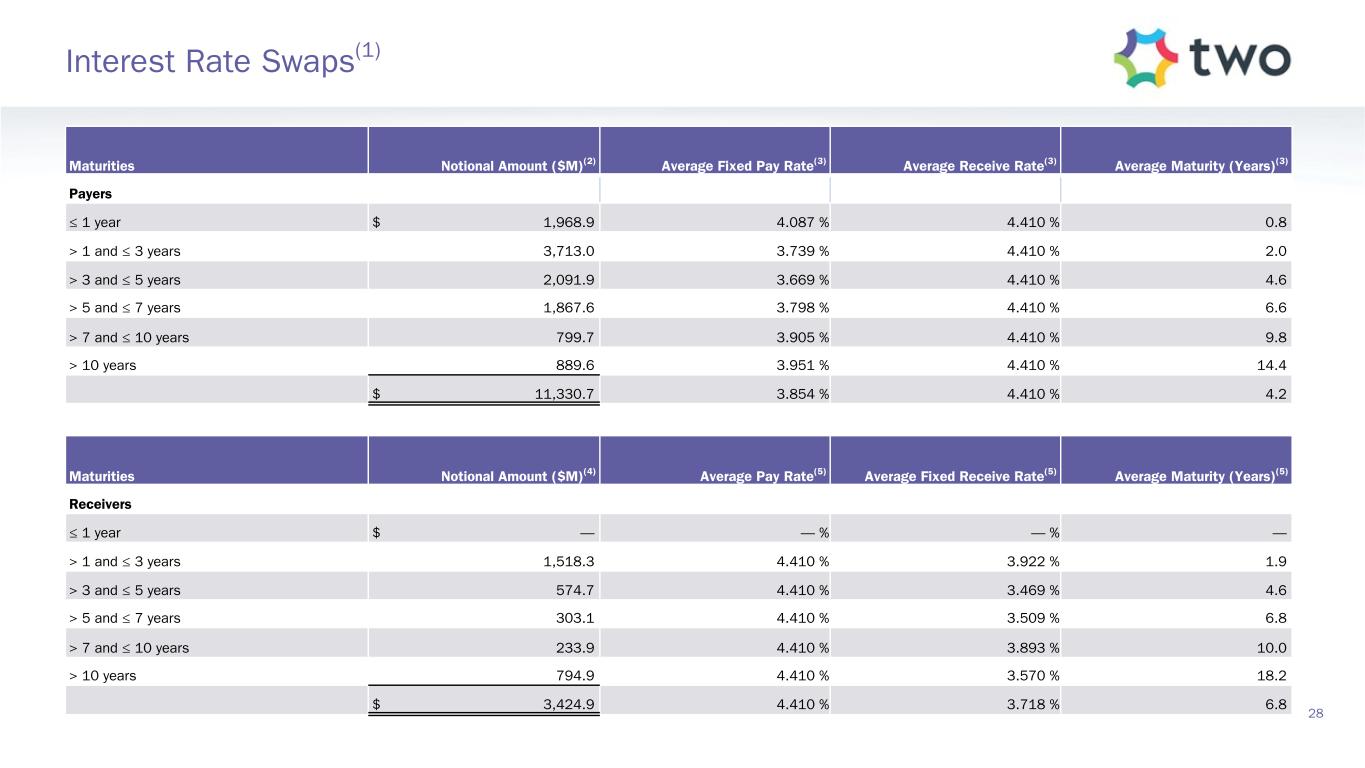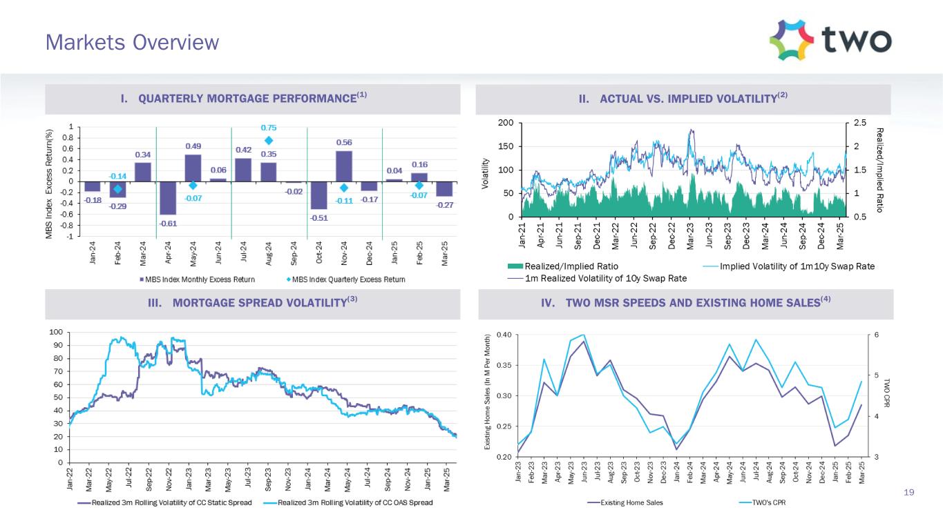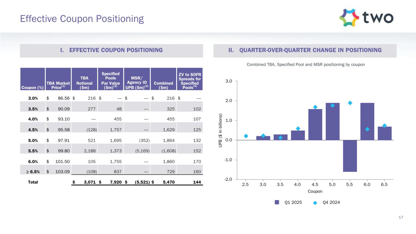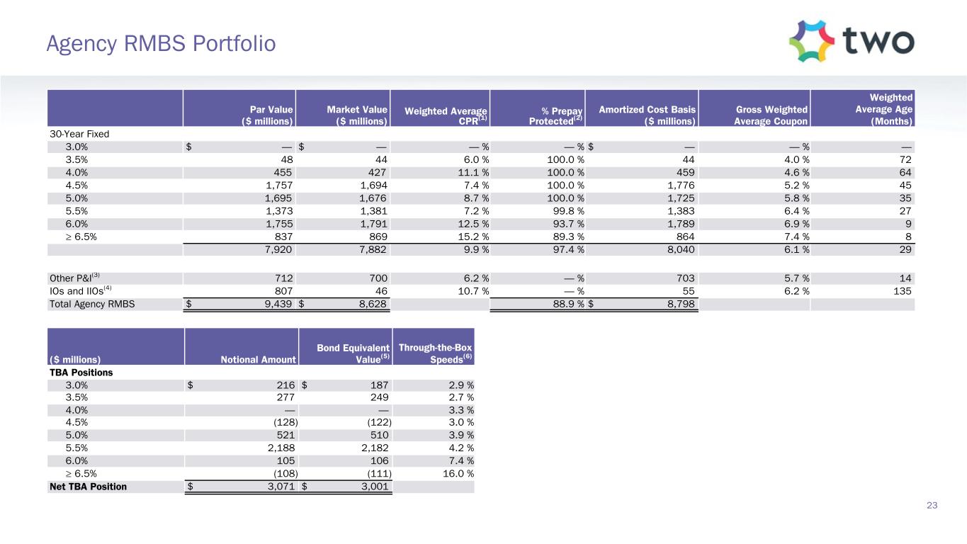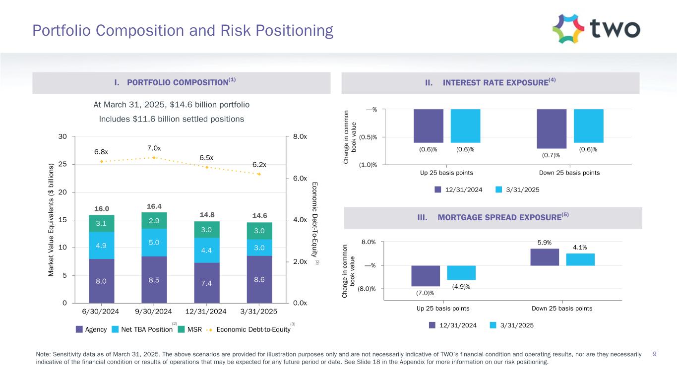 Note: Sensitivity data as of March 31, 2025. The above scenarios are provided for illustration purposes only and are not necessarily indicative of TWO’s financial condition and operating results, nor are they necessarily indicative of the financial condition or results of operations that may be expected for any future period or date. Book Value Exposure to Changes in Rates % Change in Common Book Value 2-Year Rate (basis points) 10-Year Rate (basis points) Agency P&I RMBS/TBA MSR/Agency IO RMBS(1) Other(2) Combined -25 0 Bull Steepener(3) 2.4 % 2.8 % (2.7) % 2.5 % 0 -25 Bull Flattener(4) 5.5 % (5.7) % (2.9) % (3.1) % -50 -50 Parallel Shift(5) 15.1 % (6.5) % (11.3) % (2.7) % -25 -25 Parallel Shift(5) 7.9 % (2.9) % (5.6) % (0.6) % 0 0 Base — % — % — % — % +25 +25 Parallel Shift(5) (8.6) % 2.5 % 5.5 % (0.6) % +50 +50 Parallel Shift(5) (17.7) % 4.4 % 10.9 % (2.4) % +25 0 Bear Flattener(3) (2.3) % (3.0) % 2.6 % (2.7) % 0 +25 Bear Steepener(4) (6.3) % 5.5 % 2.9 % 2.1 % Book Value Exposure to Current Coupon Spread(6) % Change in Common Book Value Parallel Shift in Spreads (basis points) Agency P&I RMBS/TBA MSR/Agency IO RMBS(1) Combined -25 7.5 % (3.4) % 4.1 % 0 — % — % — % +25 (8.1) % 3.2 % (4.9) % 18 Risk Positioning