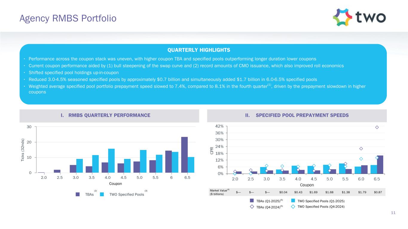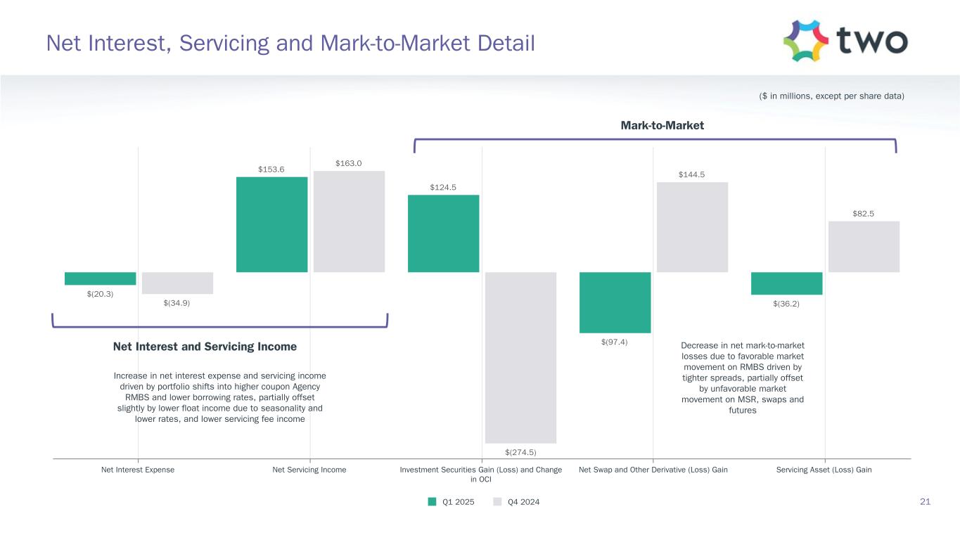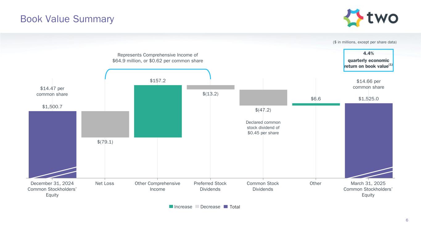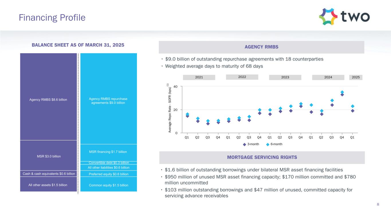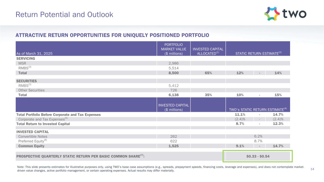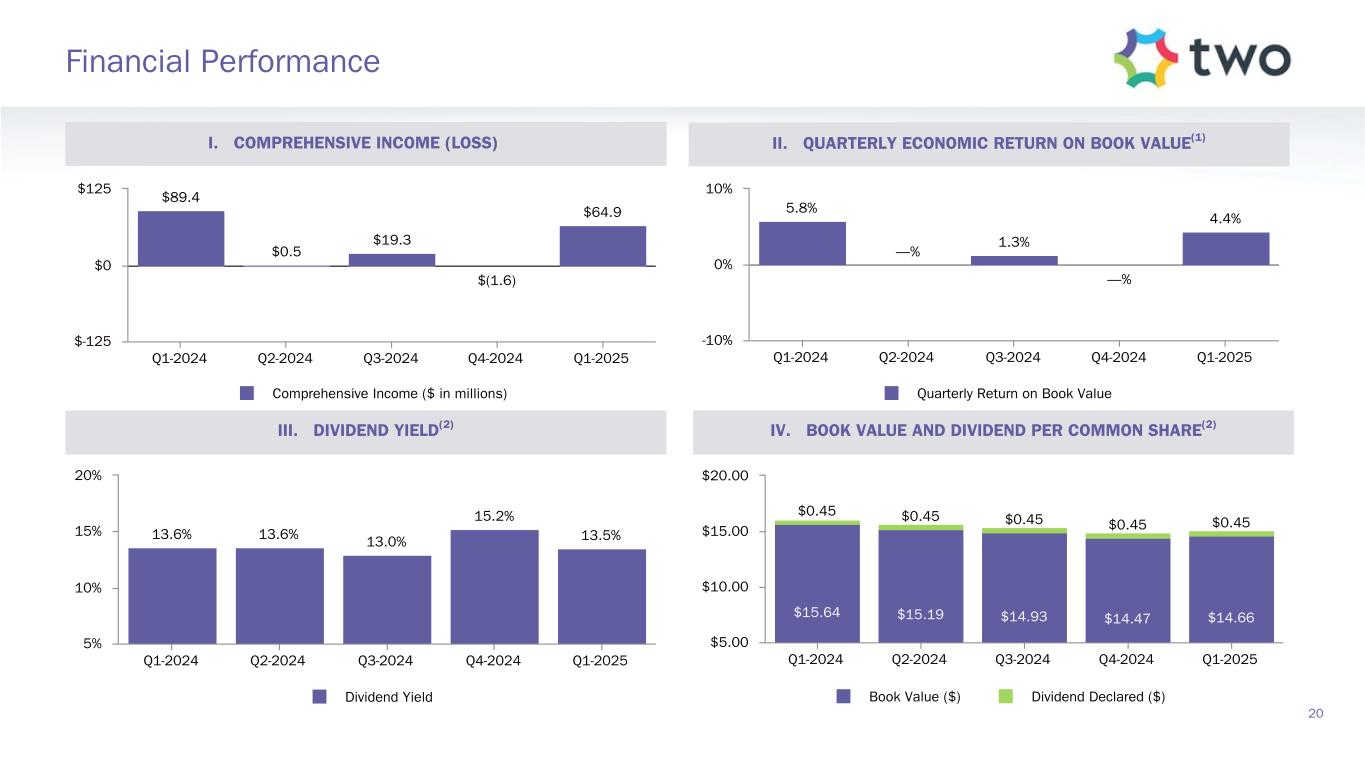Note: Sensitivity data as of March 31, 2025. The above scenarios are provided for illustration purposes only and are not necessarily indicative of TWO’s financial condition and operating results, nor are they necessarily indicative of the financial condition or results of operations that may be expected for any future period or date. Book Value Exposure to Changes in Rates % Change in Common Book Value 2-Year Rate (basis points) 10-Year Rate (basis points) Agency P&I RMBS/TBA MSR/Agency IO RMBS(1) Other(2) Combined -25 0 Bull Steepener(3) 2.4 % 2.8 % (2.7) % 2.5 % 0 -25 Bull Flattener(4) 5.5 % (5.7) % (2.9) % (3.1) % -50 -50 Parallel Shift(5) 15.1 % (6.5) % (11.3) % (2.7) % -25 -25 Parallel Shift(5) 7.9 % (2.9) % (5.6) % (0.6) % 0 0 Base — % — % — % — % +25 +25 Parallel Shift(5) (8.6) % 2.5 % 5.5 % (0.6) % +50 +50 Parallel Shift(5) (17.7) % 4.4 % 10.9 % (2.4) % +25 0 Bear Flattener(3) (2.3) % (3.0) % 2.6 % (2.7) % 0 +25 Bear Steepener(4) (6.3) % 5.5 % 2.9 % 2.1 % Book Value Exposure to Current Coupon Spread(6) % Change in Common Book Value Parallel Shift in Spreads (basis points) Agency P&I RMBS/TBA MSR/Agency IO RMBS(1) Combined -25 7.5 % (3.4) % 4.1 % 0 — % — % — % +25 (8.1) % 3.2 % (4.9) % 18 Risk Positioning