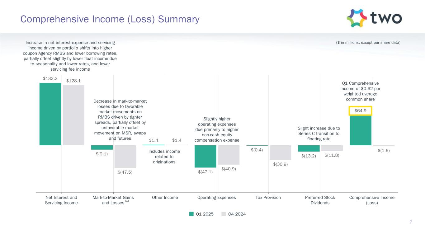 $1,500.7 $(79.1) $157.2 $(13.2) $(47.2) $6.6 $1,525.0 December 31, 2024 Common Stockholders’ Equity Net Loss Other Comprehensive Income Preferred Stock Dividends Common Stock Dividends Other March 31, 2025 Common Stockholders’ Equity ($ in millions, except per share data) $14.47 per common share $14.66 per common share Represents Comprehensive Income of $64.9 million, or $0.62 per common share Declared common stock dividend of $0.45 per share Increase Decrease Total Book Value Summary 6 4.4% quarterly economic return on book value(1)
