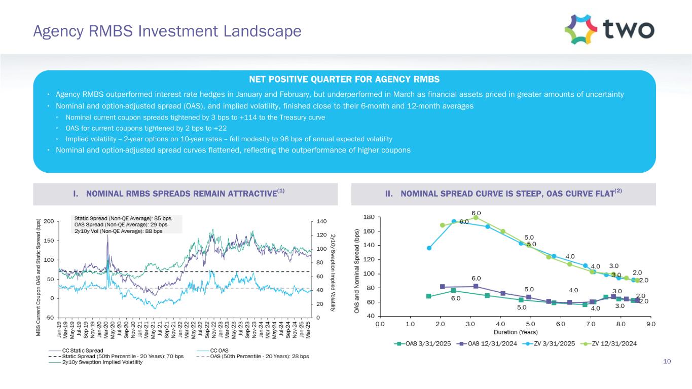 At March 31, 2025, $14.6 billion portfolio Includes $11.6 billion settled positions M ar ke t Va lu e Eq ui va le nt s ($ b ill io ns ) Econom ic D ebt-To-Equity 8.0 8.5 7.4 8.6 4.9 5.0 4.4 3.0 3.1 2.9 3.0 3.0 6.8x 7.0x 6.5x 6.2x Agency Net TBA Position MSR Economic Debt-to-Equity 6/30/2024 9/30/2024 12/31/2024 3/31/2025 0 5 10 15 20 25 30 0.0x 2.0x 4.0x 6.0x 8.0x (3) (3 ) (2) 14.614.8 16.0 16.4 Note: Sensitivity data as of March 31, 2025. The above scenarios are provided for illustration purposes only and are not necessarily indicative of TWO’s financial condition and operating results, nor are they necessarily indicative of the financial condition or results of operations that may be expected for any future period or date. See Slide 18 in the Appendix for more information on our risk positioning. C ha ng e in c om m on bo ok v al ue (0.6)% (0.7)% (0.6)% (0.6)% 12/31/2024 3/31/2025 Up 25 basis points Down 25 basis points (1.0)% (0.5)% —% C ha ng e in c om m on bo ok v al ue (7.0)% 5.9% (4.9)% 4.1% 12/31/2024 3/31/2025 Up 25 basis points Down 25 basis points (8.0)% —% 8.0% 9 Portfolio Composition and Risk Positioning I. PORTFOLIO COMPOSITION(1) II. INTEREST RATE EXPOSURE(4) III. MORTGAGE SPREAD EXPOSURE(5)