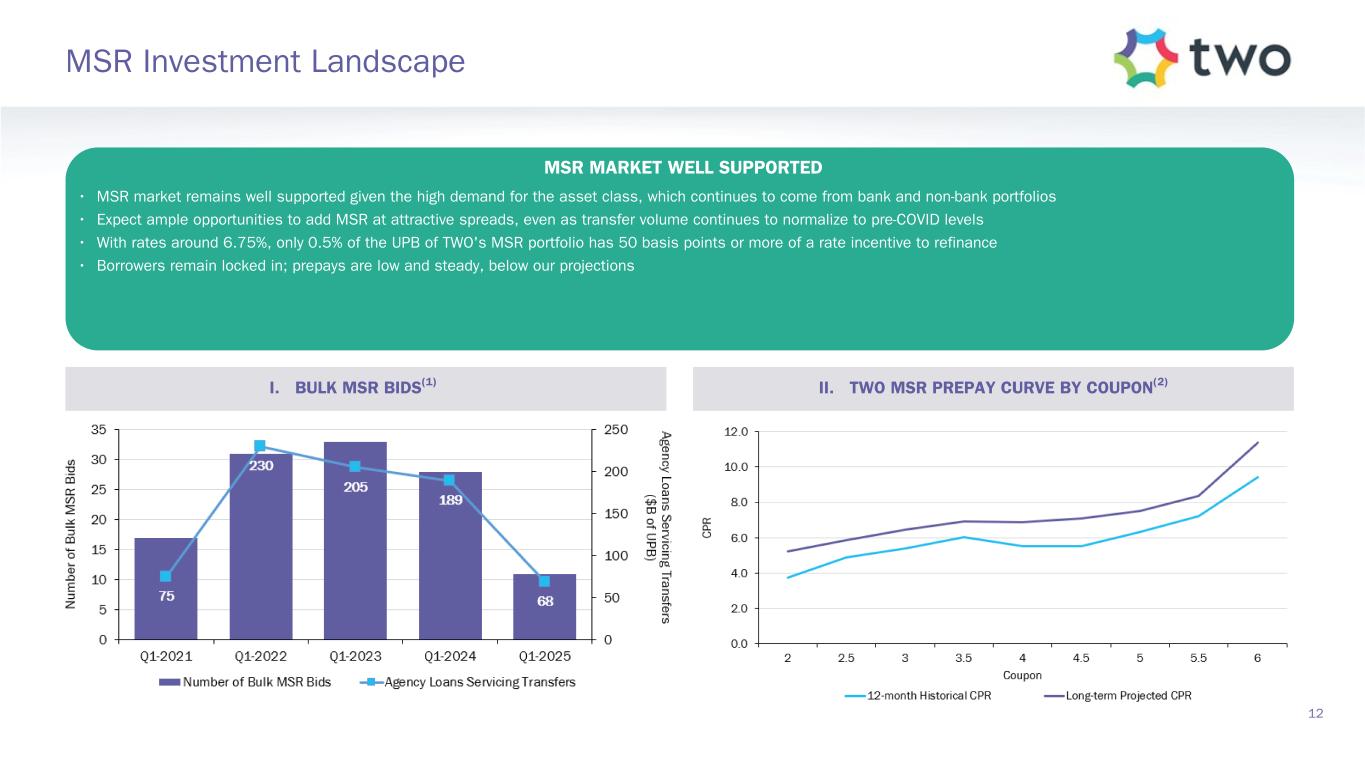 Coupon Ti ck s (3 2 nd s) TBAs TWO Specified Pools 2.0 2.5 3.0 3.5 4.0 4.5 5.0 5.5 6 6.5 0 10 20 30 TWO Specified Pools (Q1-2025)TBAs (Q1-2025)(5) TBAs (Q4-2024)(5) TWO Specified Pools (Q4-2024) Market Value(4) ($ billions) $— $— $— $0.04 $0.43 $1.69 $1.68 $1.38 $1.79 $0.87 11 Agency RMBS Portfolio I. RMBS QUARTERLY PERFORMANCE II. SPECIFIED POOL PREPAYMENT SPEEDS (2) (3) QUARTERLY HIGHLIGHTS • Performance across the coupon stack was uneven, with higher coupon TBA and specified pools outperforming longer duration lower coupons • Current coupon performance aided by (1) bull steepening of the swap curve and (2) record amounts of CMO issuance, which also improved roll economics • Shifted specified pool holdings up-in-coupon • Reduced 3.0-4.5% seasoned specified pools by approximately $0.7 billion and simultaneously added $1.7 billion in 6.0-6.5% specified pools • Weighted average specified pool portfolio prepayment speed slowed to 7.4%, compared to 8.1% in the fourth quarter(1), driven by the prepayment slowdown in higher coupons