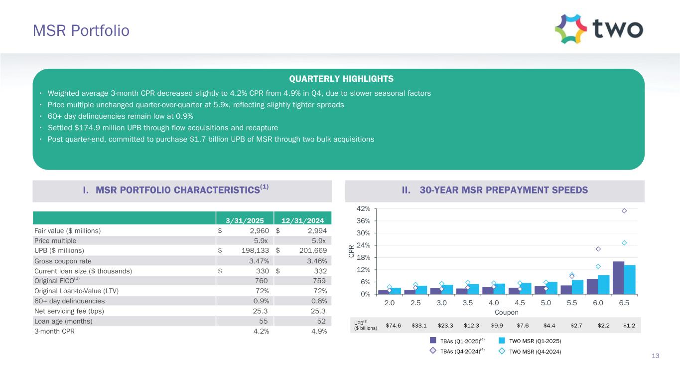 12 MSR Investment Landscape MSR MARKET WELL SUPPORTED • MSR market remains well supported given the high demand for the asset class, which continues to come from bank and non-bank portfolios • Expect ample opportunities to add MSR at attractive spreads, even as transfer volume continues to normalize to pre-COVID levels • With rates around 6.75%, only 0.5% of the UPB of TWO's MSR portfolio has 50 basis points or more of a rate incentive to refinance • Borrowers remain locked in; prepays are low and steady, below our projections I. BULK MSR BIDS(1) II. TWO MSR PREPAY CURVE BY COUPON(2)