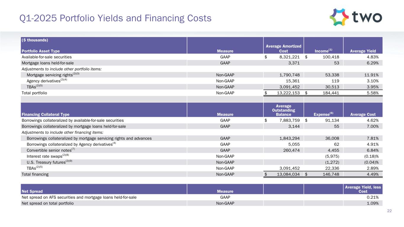 ($ thousands) Portfolio Asset Type Measure Average Amortized Cost Income(1) Average Yield Available-for-sale securities GAAP $ 8,321,221 $ 100,418 4.83% Mortgage loans held-for-sale GAAP 3,371 53 6.29% Adjustments to include other portfolio items: Mortgage servicing rights(2)(3) Non-GAAP 1,790,748 53,338 11.91% Agency derivatives(2)(4) Non-GAAP 15,361 119 3.10 % TBAs(2)(5) Non-GAAP 3,091,452 30,513 3.95 % Total portfolio Non-GAAP $ 13,222,153 $ 184,441 5.58% Financing Collateral Type Measure Average Outstanding Balance Expense(6) Average Cost Borrowings collateralized by available-for-sale securities GAAP $ 7,883,759 $ 91,134 4.62% Borrowings collateralized by mortgage loans held-for-sale GAAP 3,144 55 7.00 % Adjustments to include other financing items: Borrowings collateralized by mortgage servicing rights and advances GAAP 1,843,294 36,008 7.81 % Borrowings collateralized by Agency derivatives(4) GAAP 5,055 62 4.91 % Convertible senior notes(7) GAAP 260,474 4,455 6.84 % Interest rate swaps(2)(8) Non-GAAP (5,975) (0.18) % U.S. Treasury futures(2)(9) Non-GAAP (1,272) (0.04) % TBAs(2)(5) Non-GAAP 3,091,452 22,336 2.89 % Total financing Non-GAAP $ 13,084,034 $ 146,748 4.49 % Net Spread Measure Average Yield, less Cost Net spread on AFS securities and mortgage loans held-for-sale GAAP 0.21% Net spread on total portfolio Non-GAAP 1.09% 22 Q1-2025 Portfolio Yields and Financing Costs
