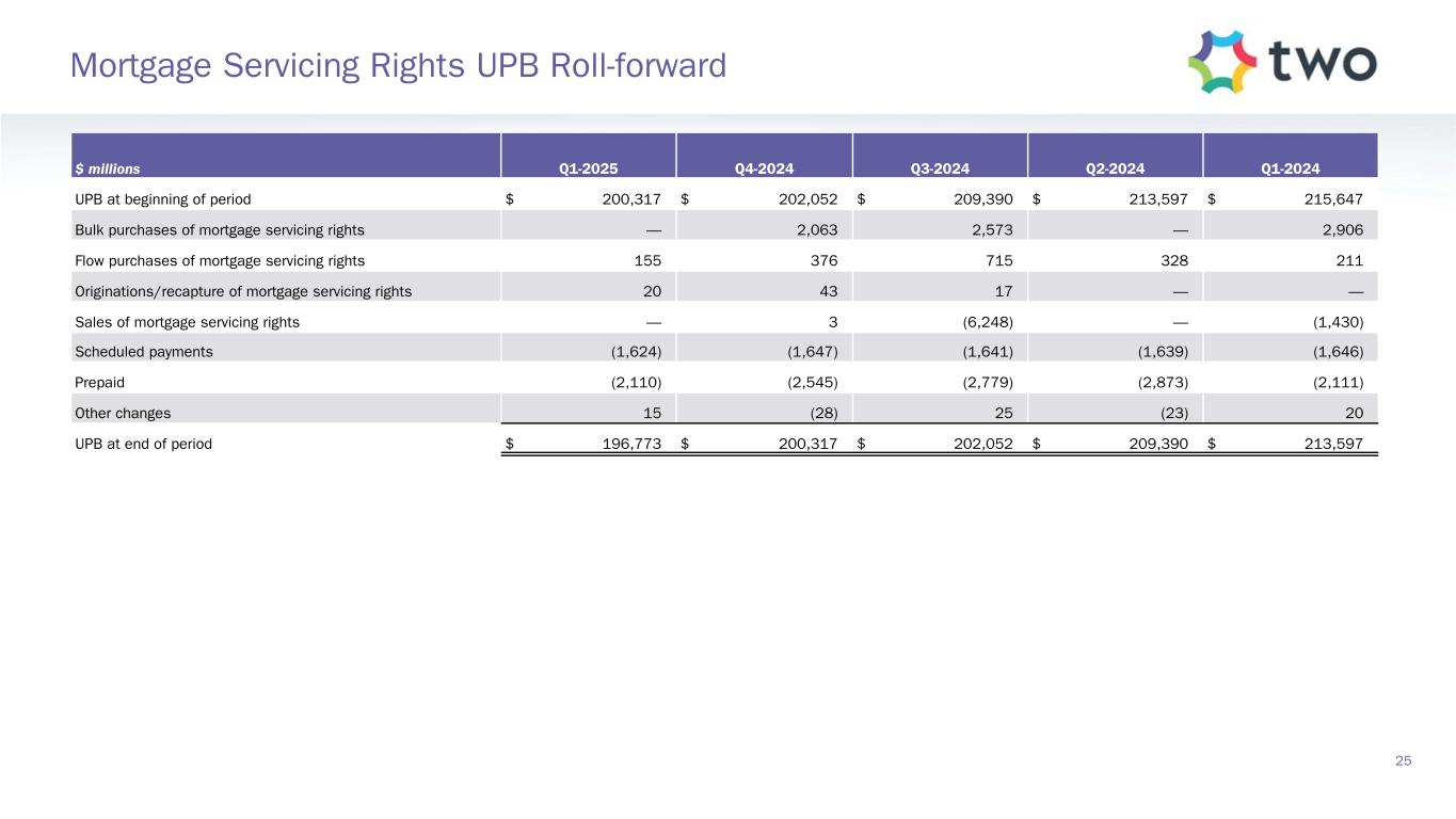 $ millions Q1-2025 Q4-2024 Q3-2024 Q2-2024 Q1-2024 UPB at beginning of period $ 200,317 $ 202,052 $ 209,390 $ 213,597 $ 215,647 Bulk purchases of mortgage servicing rights — 2,063 2,573 — 2,906 Flow purchases of mortgage servicing rights 155 376 715 328 211 Originations/recapture of mortgage servicing rights 20 43 17 — — Sales of mortgage servicing rights — 3 (6,248) — (1,430) Scheduled payments (1,624) (1,647) (1,641) (1,639) (1,646) Prepaid (2,110) (2,545) (2,779) (2,873) (2,111) Other changes 15 (28) 25 (23) 20 UPB at end of period $ 196,773 $ 200,317 $ 202,052 $ 209,390 $ 213,597 25 Mortgage Servicing Rights UPB Roll-forward