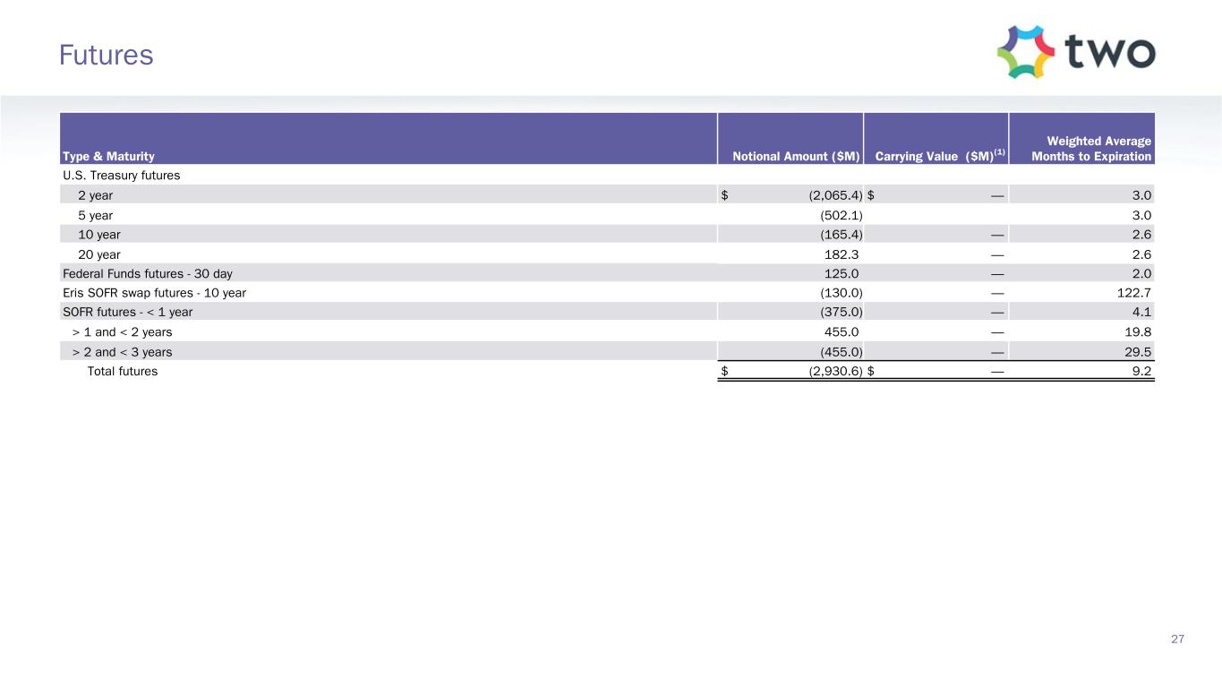 Type & Maturity Notional Amount ($M) Carrying Value ($M)(1) Weighted Average Months to Expiration U.S. Treasury futures 2 year $ (2,065.4) $ — 3.0 5 year (502.1) 3.0 10 year (165.4) — 2.6 20 year 182.3 — 2.6 Federal Funds futures - 30 day 125.0 — 2.0 Eris SOFR swap futures - 10 year (130.0) — 122.7 SOFR futures - < 1 year (375.0) — 4.1 > 1 and < 2 years 455.0 — 19.8 > 2 and < 3 years (455.0) — 29.5 Total futures $ (2,930.6) $ — 9.2 27 Futures