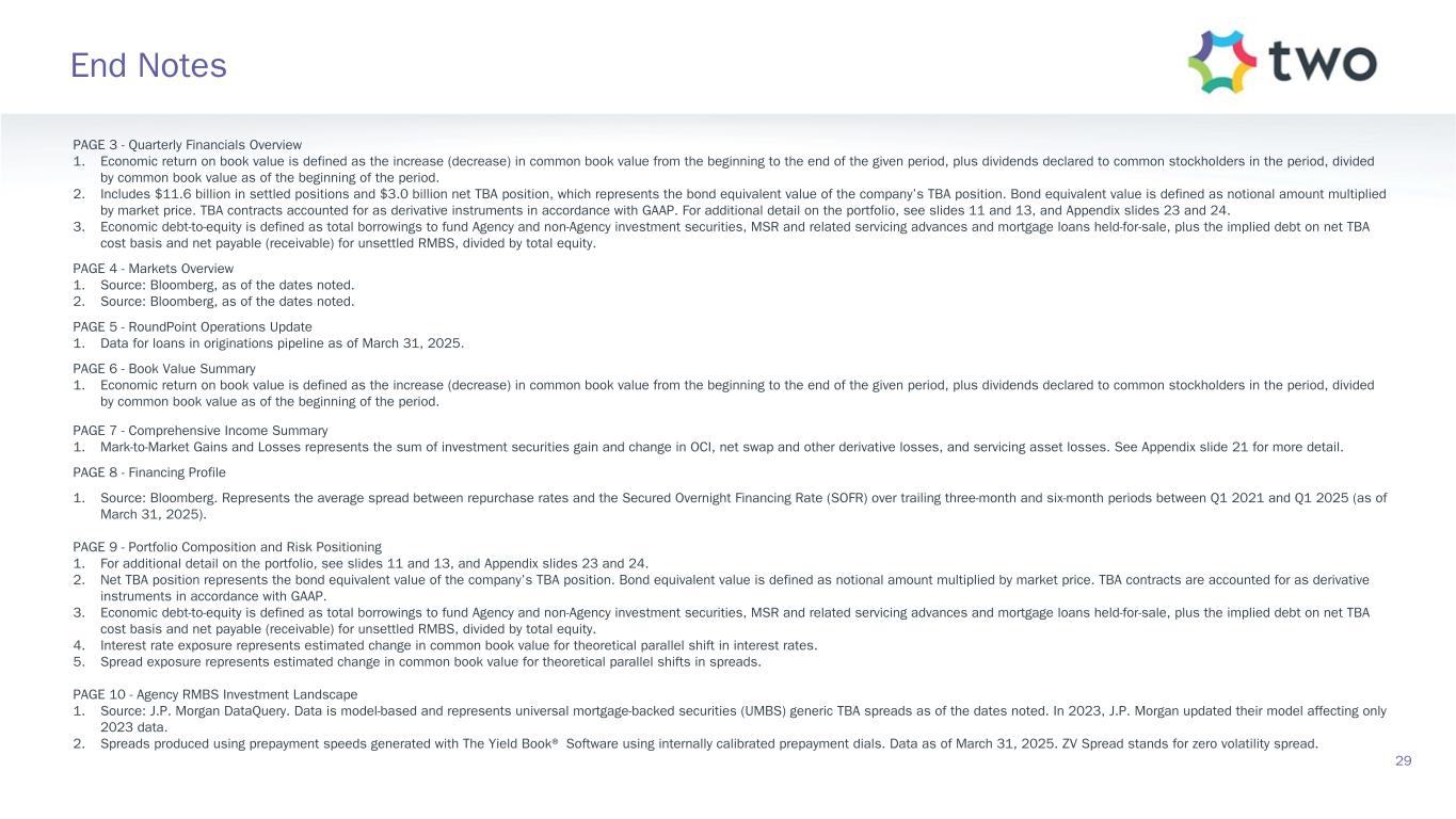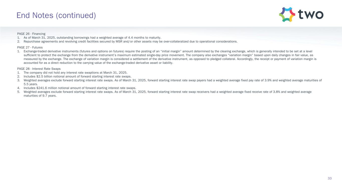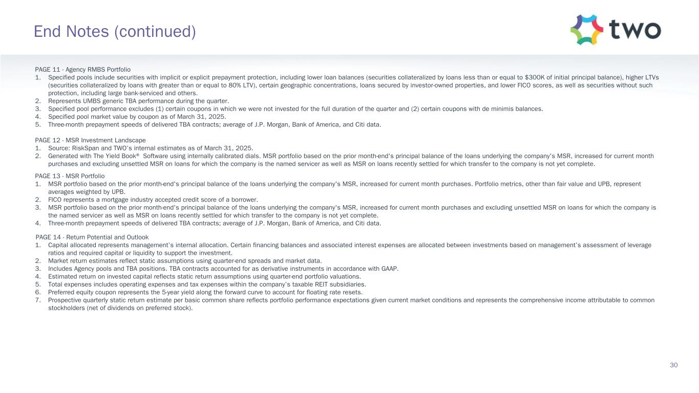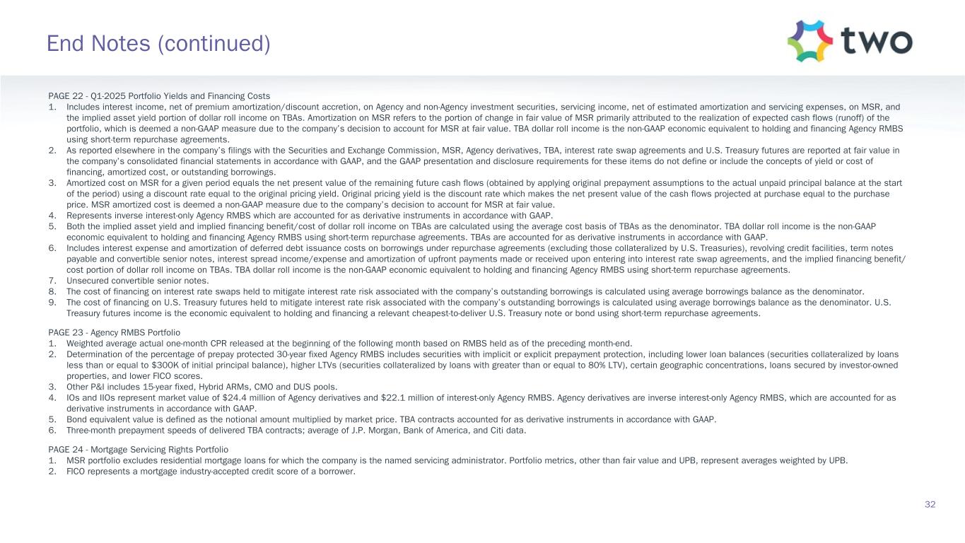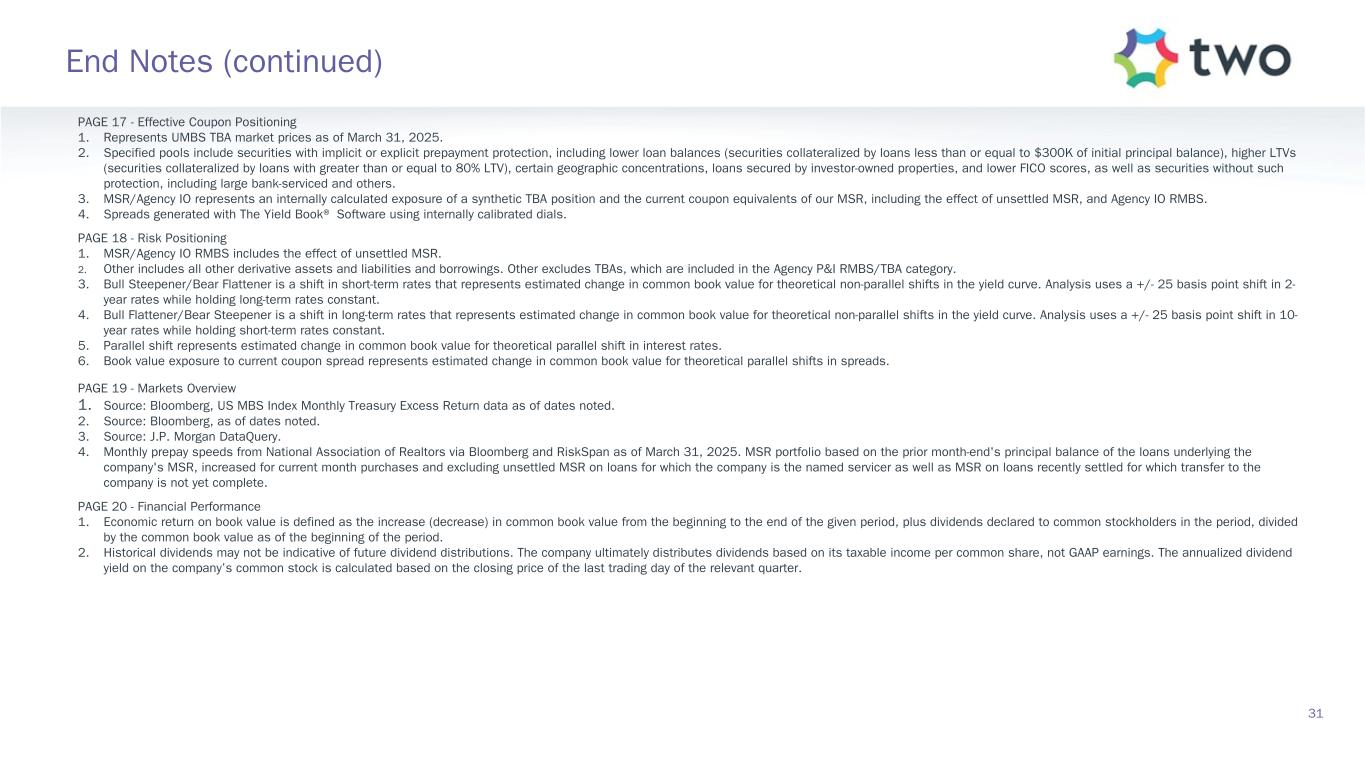 PAGE 11 - Agency RMBS Portfolio 1. Specified pools include securities with implicit or explicit prepayment protection, including lower loan balances (securities collateralized by loans less than or equal to $300K of initial principal balance), higher LTVs (securities collateralized by loans with greater than or equal to 80% LTV), certain geographic concentrations, loans secured by investor-owned properties, and lower FICO scores, as well as securities without such protection, including large bank-serviced and others. 2. Represents UMBS generic TBA performance during the quarter. 3. Specified pool performance excludes (1) certain coupons in which we were not invested for the full duration of the quarter and (2) certain coupons with de minimis balances. 4. Specified pool market value by coupon as of March 31, 2025. 5. Three-month prepayment speeds of delivered TBA contracts; average of J.P. Morgan, Bank of America, and Citi data. PAGE 12 - MSR Investment Landscape 1. Source: RiskSpan and TWO’s internal estimates as of March 31, 2025. 2. Generated with The Yield Book® Software using internally calibrated dials. MSR portfolio based on the prior month-end's principal balance of the loans underlying the company's MSR, increased for current month purchases and excluding unsettled MSR on loans for which the company is the named servicer as well as MSR on loans recently settled for which transfer to the company is not yet complete. PAGE 13 - MSR Portfolio 1. MSR portfolio based on the prior month-end's principal balance of the loans underlying the company's MSR, increased for current month purchases. Portfolio metrics, other than fair value and UPB, represent averages weighted by UPB. 2. FICO represents a mortgage industry accepted credit score of a borrower. 3. MSR portfolio based on the prior month-end's principal balance of the loans underlying the company's MSR, increased for current month purchases and excluding unsettled MSR on loans for which the company is the named servicer as well as MSR on loans recently settled for which transfer to the company is not yet complete. 4. Three-month prepayment speeds of delivered TBA contracts; average of J.P. Morgan, Bank of America, and Citi data. PAGE 14 - Return Potential and Outlook 1. Capital allocated represents management’s internal allocation. Certain financing balances and associated interest expenses are allocated between investments based on management’s assessment of leverage ratios and required capital or liquidity to support the investment. 2. Market return estimates reflect static assumptions using quarter-end spreads and market data. 3. Includes Agency pools and TBA positions. TBA contracts accounted for as derivative instruments in accordance with GAAP. 4. Estimated return on invested capital reflects static return assumptions using quarter-end portfolio valuations. 5. Total expenses includes operating expenses and tax expenses within the company’s taxable REIT subsidiaries. 6. Preferred equity coupon represents the 5-year yield along the forward curve to account for floating rate resets. 7. Prospective quarterly static return estimate per basic common share reflects portfolio performance expectations given current market conditions and represents the comprehensive income attributable to common stockholders (net of dividends on preferred stock). 30 End Notes (continued)