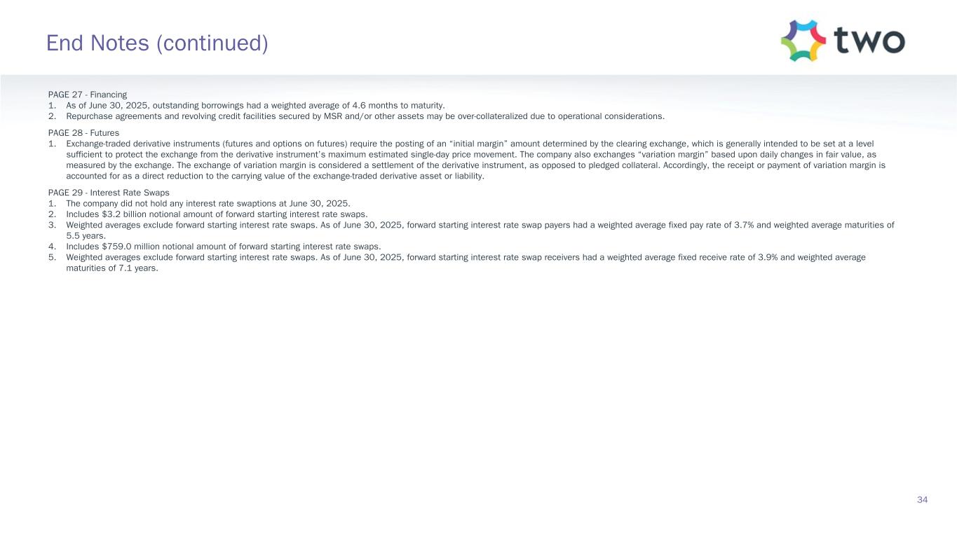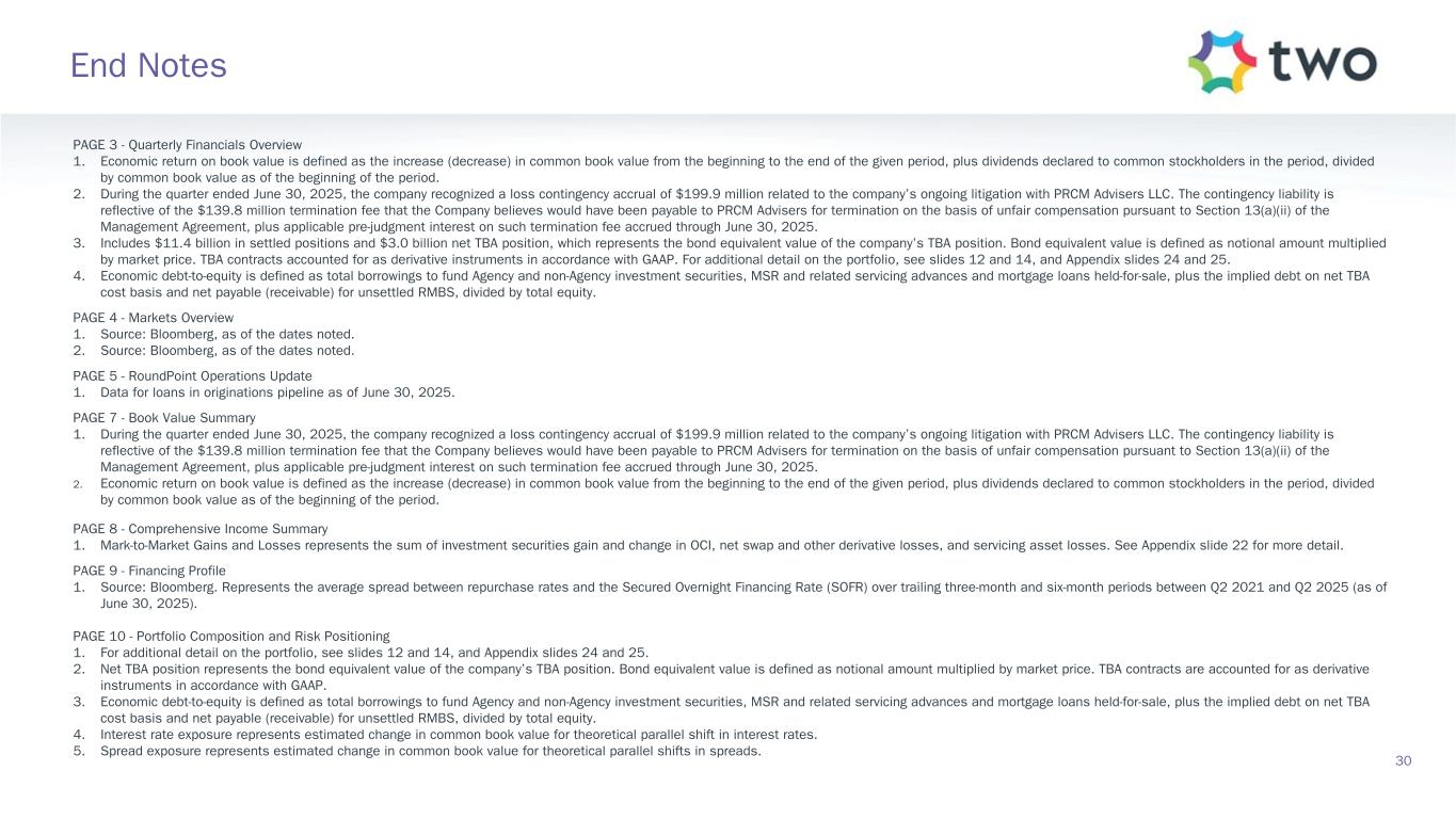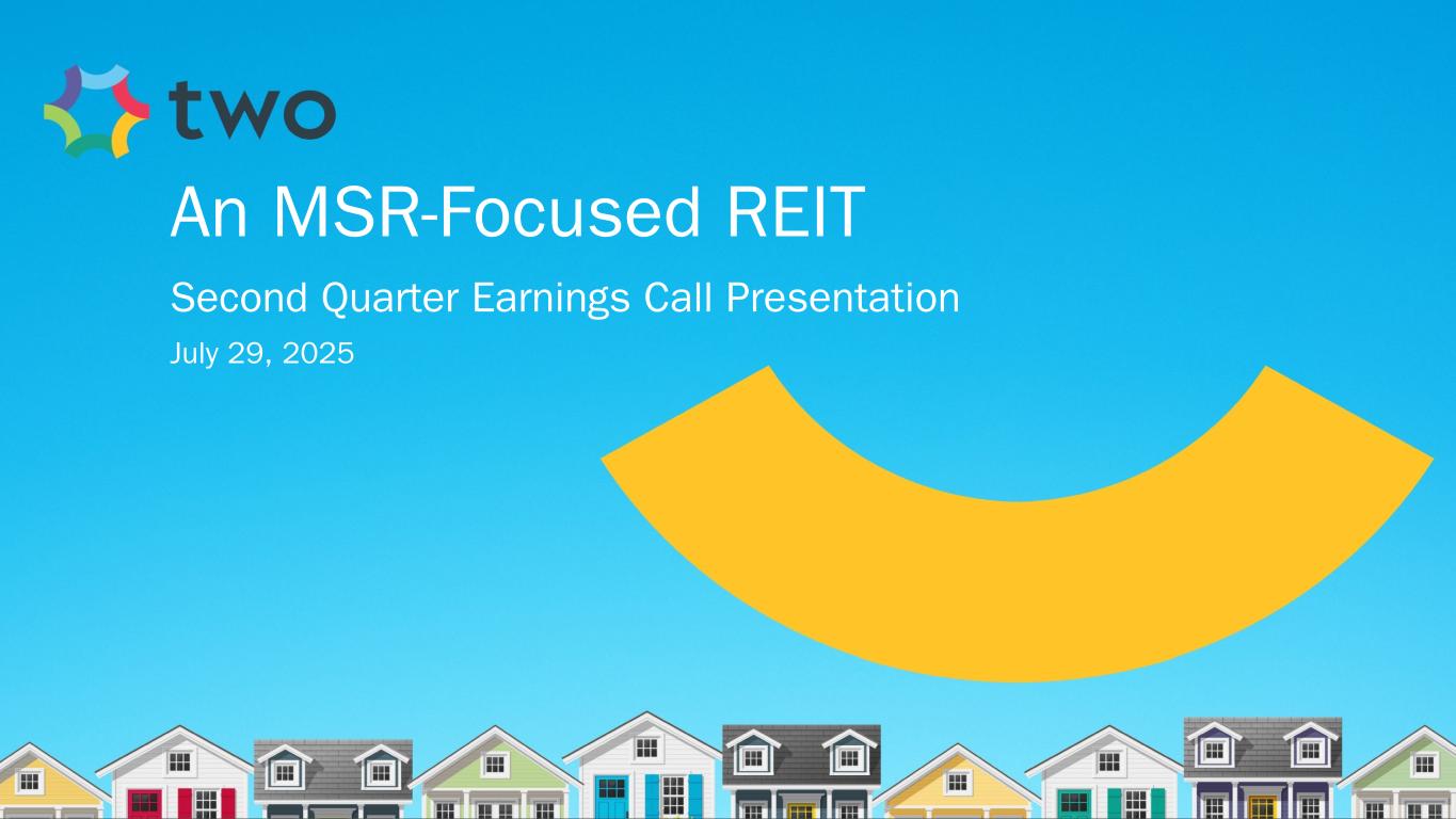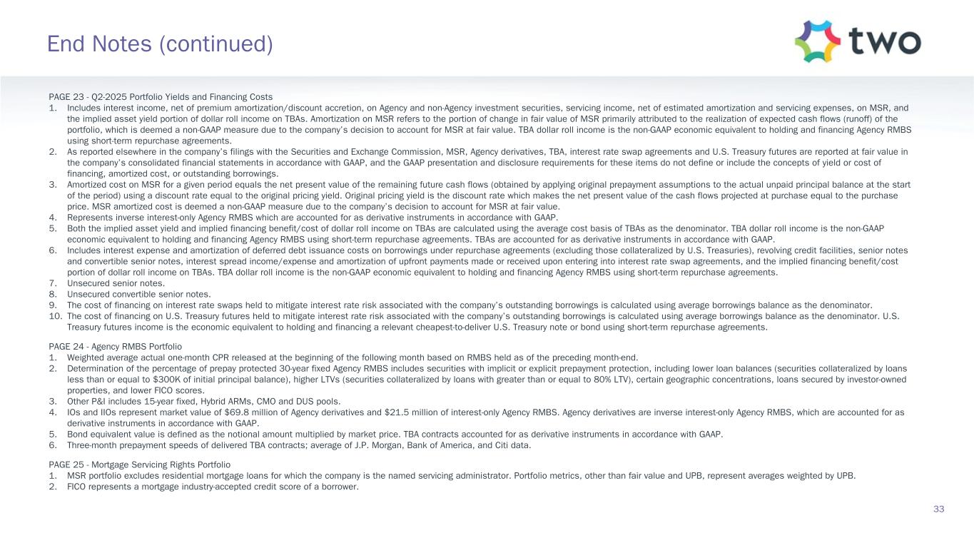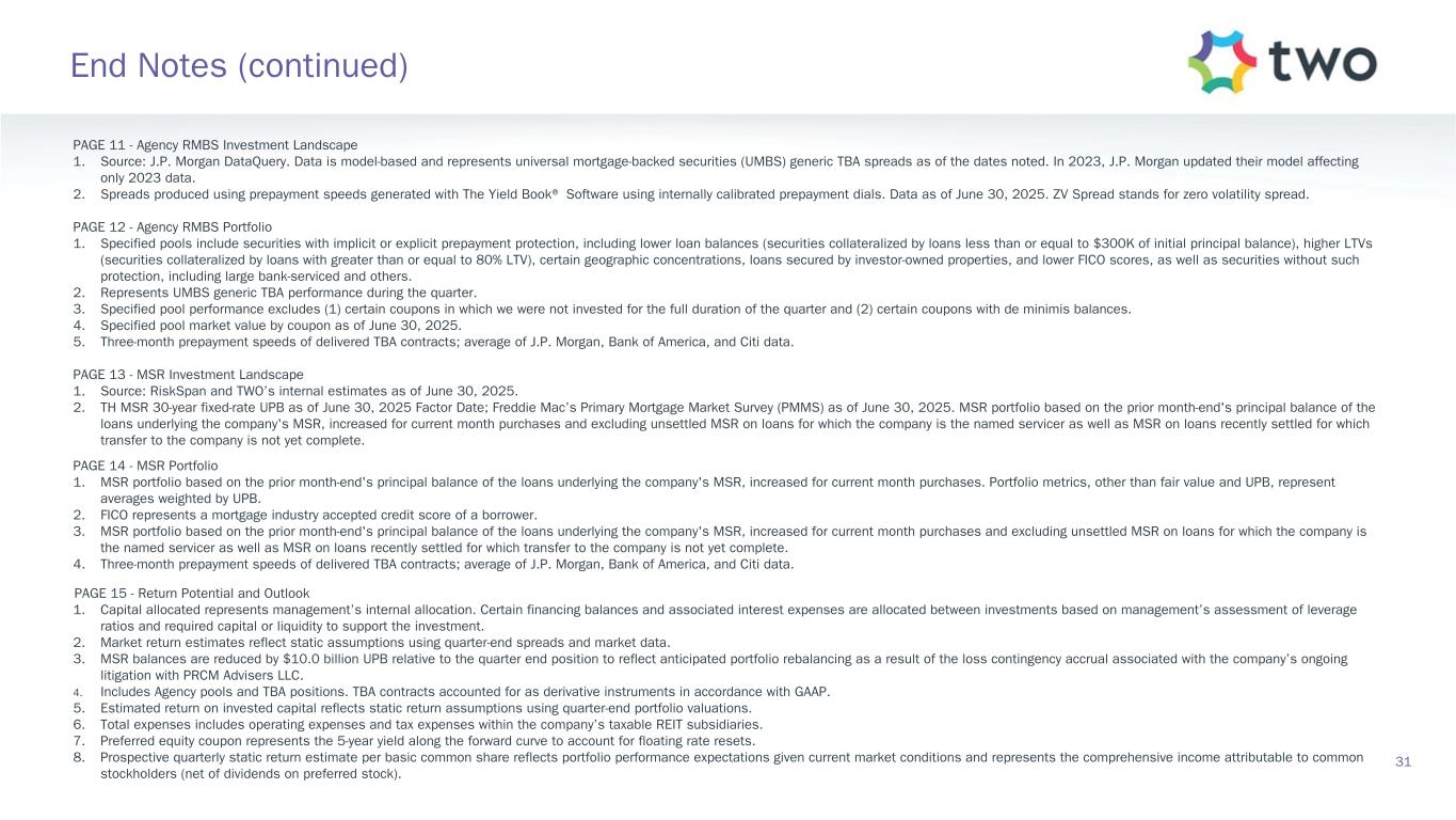 PAGE 11 - Agency RMBS Investment Landscape 1. Source: J.P. Morgan DataQuery. Data is model-based and represents universal mortgage-backed securities (UMBS) generic TBA spreads as of the dates noted. In 2023, J.P. Morgan updated their model affecting only 2023 data. 2. Spreads produced using prepayment speeds generated with The Yield Book® Software using internally calibrated prepayment dials. Data as of June 30, 2025. ZV Spread stands for zero volatility spread. PAGE 12 - Agency RMBS Portfolio 1. Specified pools include securities with implicit or explicit prepayment protection, including lower loan balances (securities collateralized by loans less than or equal to $300K of initial principal balance), higher LTVs (securities collateralized by loans with greater than or equal to 80% LTV), certain geographic concentrations, loans secured by investor-owned properties, and lower FICO scores, as well as securities without such protection, including large bank-serviced and others. 2. Represents UMBS generic TBA performance during the quarter. 3. Specified pool performance excludes (1) certain coupons in which we were not invested for the full duration of the quarter and (2) certain coupons with de minimis balances. 4. Specified pool market value by coupon as of June 30, 2025. 5. Three-month prepayment speeds of delivered TBA contracts; average of J.P. Morgan, Bank of America, and Citi data. PAGE 13 - MSR Investment Landscape 1. Source: RiskSpan and TWO’s internal estimates as of June 30, 2025. 2. TH MSR 30-year fixed-rate UPB as of June 30, 2025 Factor Date; Freddie Mac’s Primary Mortgage Market Survey (PMMS) as of June 30, 2025. MSR portfolio based on the prior month-end's principal balance of the loans underlying the company's MSR, increased for current month purchases and excluding unsettled MSR on loans for which the company is the named servicer as well as MSR on loans recently settled for which transfer to the company is not yet complete. PAGE 14 - MSR Portfolio 1. MSR portfolio based on the prior month-end's principal balance of the loans underlying the company's MSR, increased for current month purchases. Portfolio metrics, other than fair value and UPB, represent averages weighted by UPB. 2. FICO represents a mortgage industry accepted credit score of a borrower. 3. MSR portfolio based on the prior month-end's principal balance of the loans underlying the company's MSR, increased for current month purchases and excluding unsettled MSR on loans for which the company is the named servicer as well as MSR on loans recently settled for which transfer to the company is not yet complete. 4. Three-month prepayment speeds of delivered TBA contracts; average of J.P. Morgan, Bank of America, and Citi data. PAGE 15 - Return Potential and Outlook 1. Capital allocated represents management’s internal allocation. Certain financing balances and associated interest expenses are allocated between investments based on management’s assessment of leverage ratios and required capital or liquidity to support the investment. 2. Market return estimates reflect static assumptions using quarter-end spreads and market data. 3. MSR balances are reduced by $10.0 billion UPB relative to the quarter end position to reflect anticipated portfolio rebalancing as a result of the loss contingency accrual associated with the company’s ongoing litigation with PRCM Advisers LLC. 4. Includes Agency pools and TBA positions. TBA contracts accounted for as derivative instruments in accordance with GAAP. 5. Estimated return on invested capital reflects static return assumptions using quarter-end portfolio valuations. 6. Total expenses includes operating expenses and tax expenses within the company’s taxable REIT subsidiaries. 7. Preferred equity coupon represents the 5-year yield along the forward curve to account for floating rate resets. 8. Prospective quarterly static return estimate per basic common share reflects portfolio performance expectations given current market conditions and represents the comprehensive income attributable to common stockholders (net of dividends on preferred stock). 31 End Notes (continued)