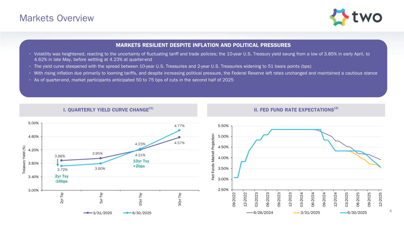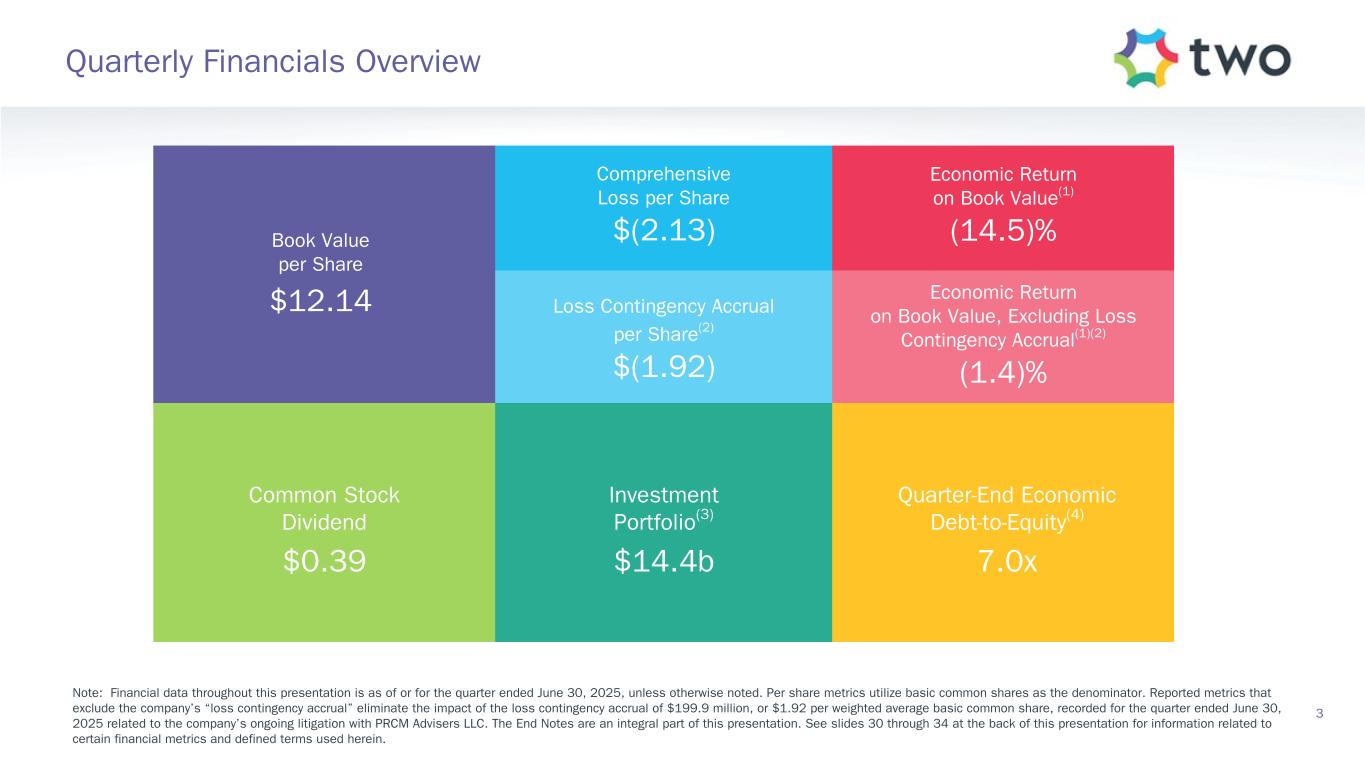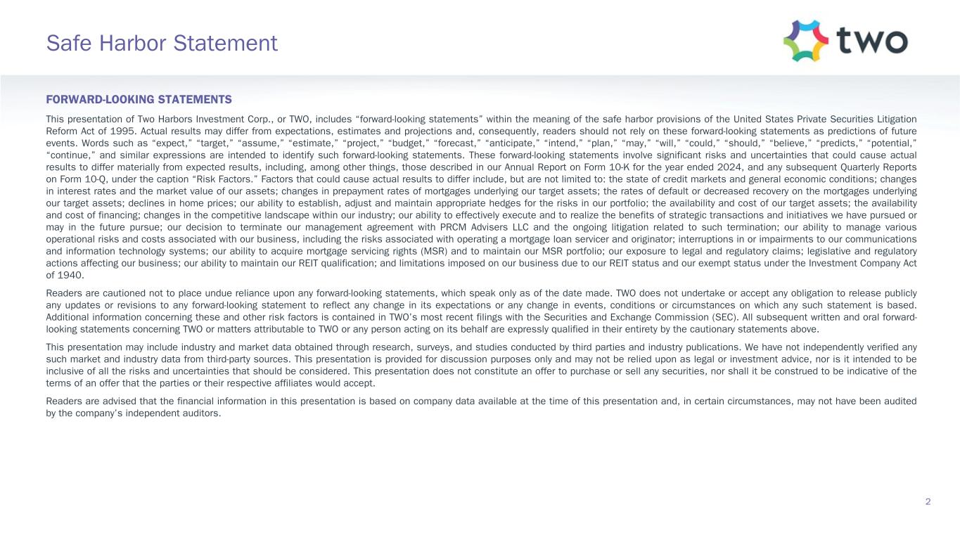 Safe Harbor Statement 2 FORWARD-LOOKING STATEMENTS This presentation of Two Harbors Investment Corp., or TWO, includes “forward-looking statements” within the meaning of the safe harbor provisions of the United States Private Securities Litigation Reform Act of 1995. Actual results may differ from expectations, estimates and projections and, consequently, readers should not rely on these forward-looking statements as predictions of future events. Words such as “expect,” “target,” “assume,” “estimate,” “project,” “budget,” “forecast,” “anticipate,” “intend,” “plan,” “may,” “will,” “could,” “should,” “believe,” “predicts,” “potential,” “continue,” and similar expressions are intended to identify such forward-looking statements. These forward-looking statements involve significant risks and uncertainties that could cause actual results to differ materially from expected results, including, among other things, those described in our Annual Report on Form 10-K for the year ended 2024, and any subsequent Quarterly Reports on Form 10-Q, under the caption “Risk Factors.” Factors that could cause actual results to differ include, but are not limited to: the state of credit markets and general economic conditions; changes in interest rates and the market value of our assets; changes in prepayment rates of mortgages underlying our target assets; the rates of default or decreased recovery on the mortgages underlying our target assets; declines in home prices; our ability to establish, adjust and maintain appropriate hedges for the risks in our portfolio; the availability and cost of our target assets; the availability and cost of financing; changes in the competitive landscape within our industry; our ability to effectively execute and to realize the benefits of strategic transactions and initiatives we have pursued or may in the future pursue; our decision to terminate our management agreement with PRCM Advisers LLC and the ongoing litigation related to such termination; our ability to manage various operational risks and costs associated with our business, including the risks associated with operating a mortgage loan servicer and originator; interruptions in or impairments to our communications and information technology systems; our ability to acquire mortgage servicing rights (MSR) and to maintain our MSR portfolio; our exposure to legal and regulatory claims; legislative and regulatory actions affecting our business; our ability to maintain our REIT qualification; and limitations imposed on our business due to our REIT status and our exempt status under the Investment Company Act of 1940. Readers are cautioned not to place undue reliance upon any forward-looking statements, which speak only as of the date made. TWO does not undertake or accept any obligation to release publicly any updates or revisions to any forward-looking statement to reflect any change in its expectations or any change in events, conditions or circumstances on which any such statement is based. Additional information concerning these and other risk factors is contained in TWO’s most recent filings with the Securities and Exchange Commission (SEC). All subsequent written and oral forward- looking statements concerning TWO or matters attributable to TWO or any person acting on its behalf are expressly qualified in their entirety by the cautionary statements above. This presentation may include industry and market data obtained through research, surveys, and studies conducted by third parties and industry publications. We have not independently verified any such market and industry data from third-party sources. This presentation is provided for discussion purposes only and may not be relied upon as legal or investment advice, nor is it intended to be inclusive of all the risks and uncertainties that should be considered. This presentation does not constitute an offer to purchase or sell any securities, nor shall it be construed to be indicative of the terms of an offer that the parties or their respective affiliates would accept. Readers are advised that the financial information in this presentation is based on company data available at the time of this presentation and, in certain circumstances, may not have been audited by the company’s independent auditors.