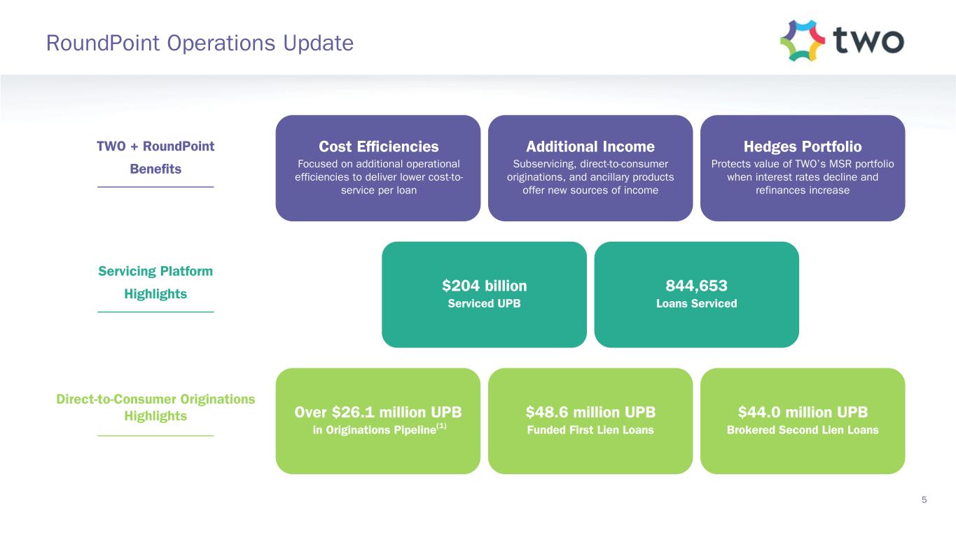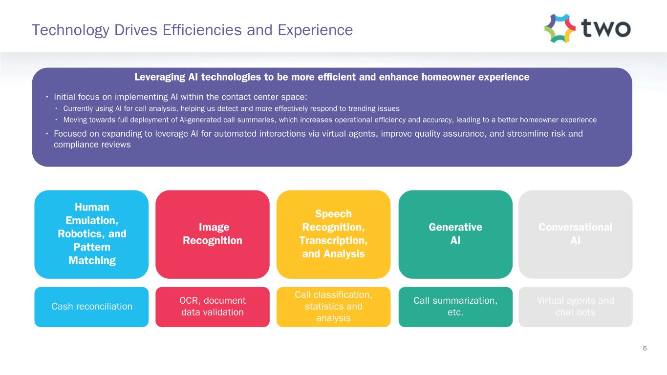 Over $26.1 million UPB in Originations Pipeline(1) $204 billion Serviced UPB 844,653 Loans Serviced Hedges Portfolio Protects value of TWO’s MSR portfolio when interest rates decline and refinances increase Cost Efficiencies Focused on additional operational efficiencies to deliver lower cost-to- service per loan Additional Income Subservicing, direct-to-consumer originations, and ancillary products offer new sources of income RoundPoint Operations Update 5 $48.6 million UPB Funded First Lien Loans Direct-to-Consumer Originations Highlights Servicing Platform Highlights TWO + RoundPoint Benefits $44.0 million UPB Brokered Second Lien Loans