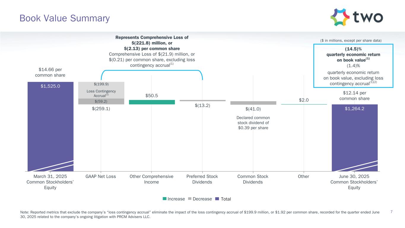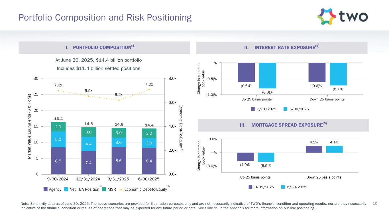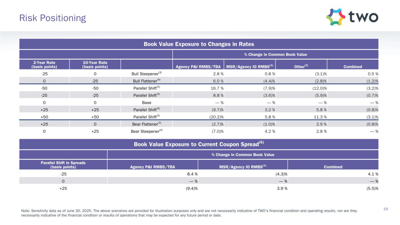 Note: Sensitivity data as of June 30, 2025. The above scenarios are provided for illustration purposes only and are not necessarily indicative of TWO’s financial condition and operating results, nor are they necessarily indicative of the financial condition or results of operations that may be expected for any future period or date. Book Value Exposure to Changes in Rates % Change in Common Book Value 2-Year Rate (basis points) 10-Year Rate (basis points) Agency P&I RMBS/TBA MSR/Agency IO RMBS(1) Other(2) Combined -25 0 Bull Steepener(3) 2.8 % 0.8 % (3.1) % 0.5 % 0 -25 Bull Flattener(4) 6.0 % (4.4) % (2.8) % (1.2) % -50 -50 Parallel Shift(5) 16.7 % (7.9) % (12.0) % (3.2) % -25 -25 Parallel Shift(5) 8.8 % (3.6) % (5.9) % (0.7) % 0 0 Base — % — % — % — % +25 +25 Parallel Shift(5) (9.7) % 3.2 % 5.8 % (0.8) % +50 +50 Parallel Shift(5) (20.2) % 5.8 % 11.3 % (3.1) % +25 0 Bear Flattener(3) (2.7) % (1.0) % 2.9 % (0.8) % 0 +25 Bear Steepener(4) (7.0) % 4.2 % 2.8 % — % Book Value Exposure to Current Coupon Spread(6) % Change in Common Book Value Parallel Shift in Spreads (basis points) Agency P&I RMBS/TBA MSR/Agency IO RMBS(1) Combined -25 8.4 % (4.3) % 4.1 % 0 — % — % — % +25 (9.4) % 3.9 % (5.5) % 19 Risk Positioning