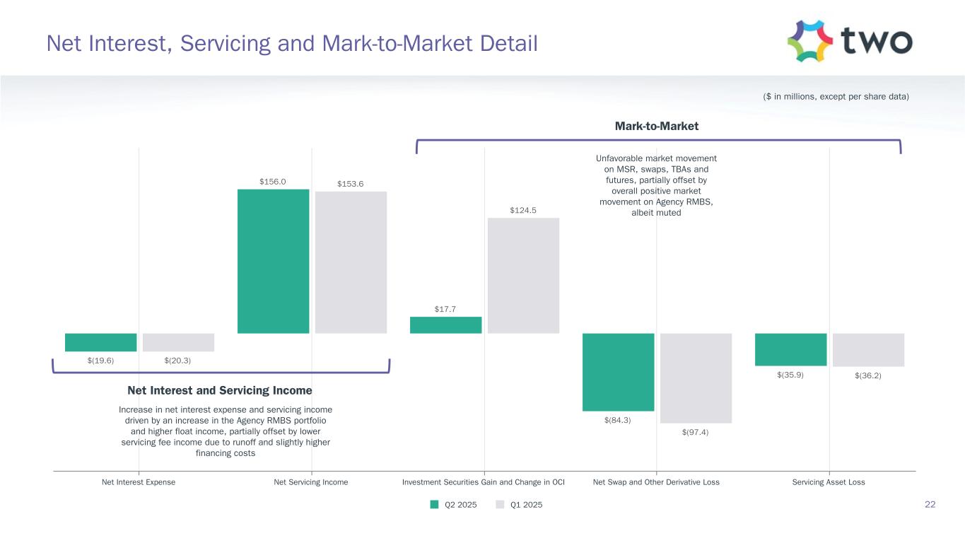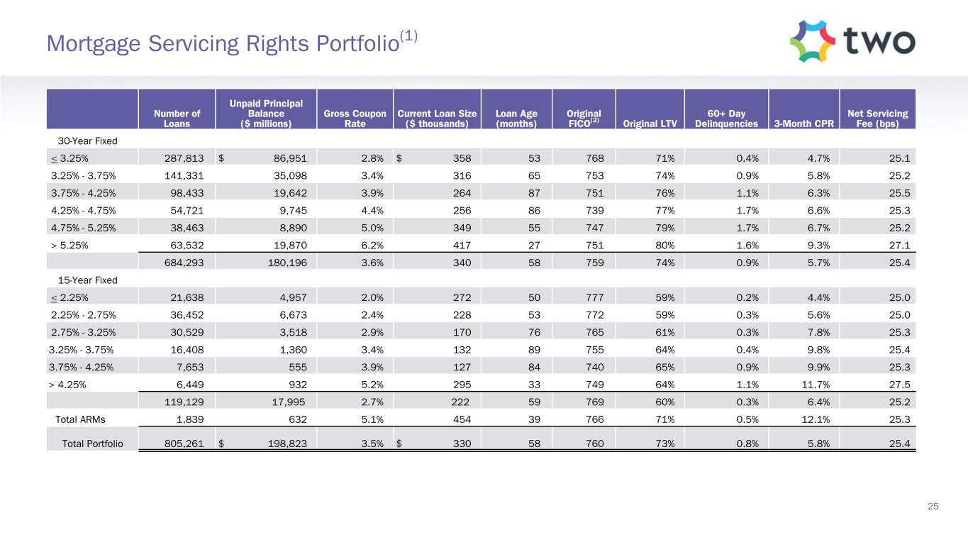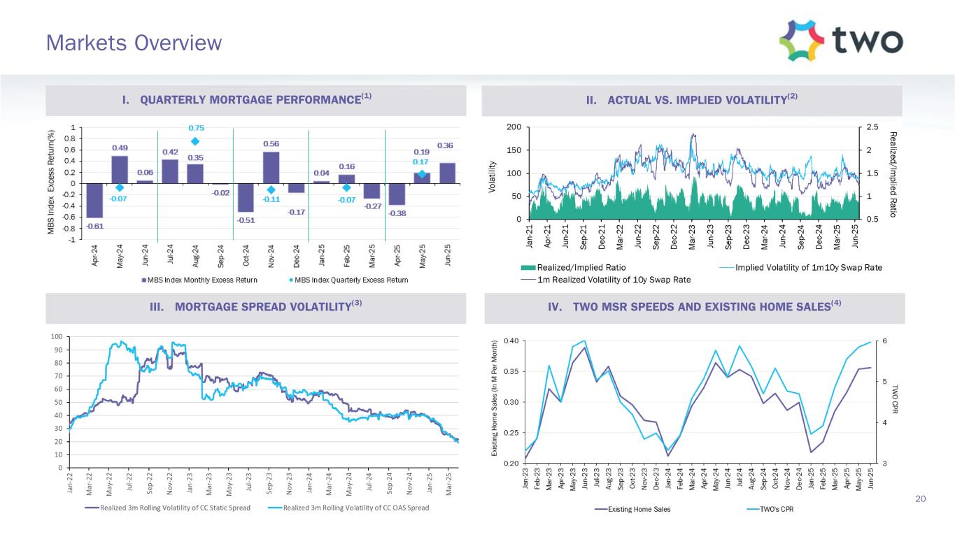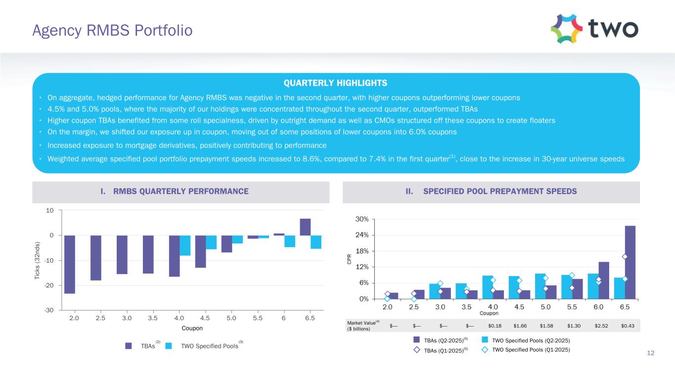 Note: Sensitivity data as of June 30, 2025. The above scenarios are provided for illustration purposes only and are not necessarily indicative of TWO’s financial condition and operating results, nor are they necessarily indicative of the financial condition or results of operations that may be expected for any future period or date. Book Value Exposure to Changes in Rates % Change in Common Book Value 2-Year Rate (basis points) 10-Year Rate (basis points) Agency P&I RMBS/TBA MSR/Agency IO RMBS(1) Other(2) Combined -25 0 Bull Steepener(3) 2.8 % 0.8 % (3.1) % 0.5 % 0 -25 Bull Flattener(4) 6.0 % (4.4) % (2.8) % (1.2) % -50 -50 Parallel Shift(5) 16.7 % (7.9) % (12.0) % (3.2) % -25 -25 Parallel Shift(5) 8.8 % (3.6) % (5.9) % (0.7) % 0 0 Base — % — % — % — % +25 +25 Parallel Shift(5) (9.7) % 3.2 % 5.8 % (0.8) % +50 +50 Parallel Shift(5) (20.2) % 5.8 % 11.3 % (3.1) % +25 0 Bear Flattener(3) (2.7) % (1.0) % 2.9 % (0.8) % 0 +25 Bear Steepener(4) (7.0) % 4.2 % 2.8 % — % Book Value Exposure to Current Coupon Spread(6) % Change in Common Book Value Parallel Shift in Spreads (basis points) Agency P&I RMBS/TBA MSR/Agency IO RMBS(1) Combined -25 8.4 % (4.3) % 4.1 % 0 — % — % — % +25 (9.4) % 3.9 % (5.5) % 19 Risk Positioning