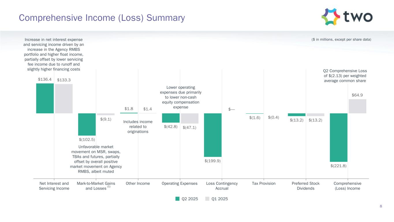 $1,525.0 $(259.1) $50.5 $(13.2) $(41.0) $2.0 $1,264.2 March 31, 2025 Common Stockholders’ Equity GAAP Net Loss Other Comprehensive Income Preferred Stock Dividends Common Stock Dividends Other June 30, 2025 Common Stockholders’ Equity ($ in millions, except per share data) $14.66 per common share $12.14 per common share Represents Comprehensive Loss of $(221.8) million, or $(2.13) per common share Comprehensive Loss of $(21.9) million, or $(0.21) per common share, excluding loss contingency accrual(1) Declared common stock dividend of $0.39 per share Increase Decrease Total Book Value Summary 7 (14.5)% quarterly economic return on book value(1) (1.4)% quarterly economic return on book value, excluding loss contingency accrual(1)(2) $(199.9) Loss Contingency Accrual(1) $(59.2) Note: Reported metrics that exclude the company’s “loss contingency accrual” eliminate the impact of the loss contingency accrual of $199.9 million, or $1.92 per common share, recorded for the quarter ended June 30, 2025 related to the company’s ongoing litigation with PRCM Advisers LLC.
