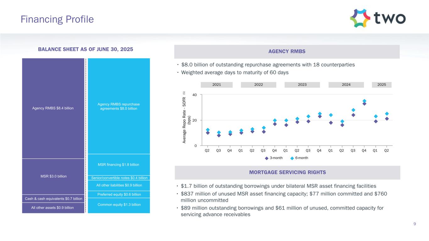 $136.4 $(102.5) $1.8 $(42.8) $(199.9) $(1.6) $(13.2) $(221.8) $133.3 $(9.1) $1.4 $(47.1) $— $(0.4) $(13.2) $64.9 Q2 2025 Q1 2025 Net Interest and Servicing Income Mark-to-Market Gains and Losses Other Income Operating Expenses Loss Contingency Accrual Tax Provision Preferred Stock Dividends Comprehensive (Loss) Income Comprehensive Income (Loss) Summary 8 ($ in millions, except per share data) Q2 Comprehensive Loss of $(2.13) per weighted average common share Lower operating expenses due primarily to lower non-cash equity compensation expense Includes income related to originations Unfavorable market movement on MSR, swaps, TBAs and futures, partially offset by overall positive market movement on Agency RMBS, albeit muted Increase in net interest expense and servicing income driven by an increase in the Agency RMBS portfolio and higher float income, partially offset by lower servicing fee income due to runoff and slightly higher financing costs (1)