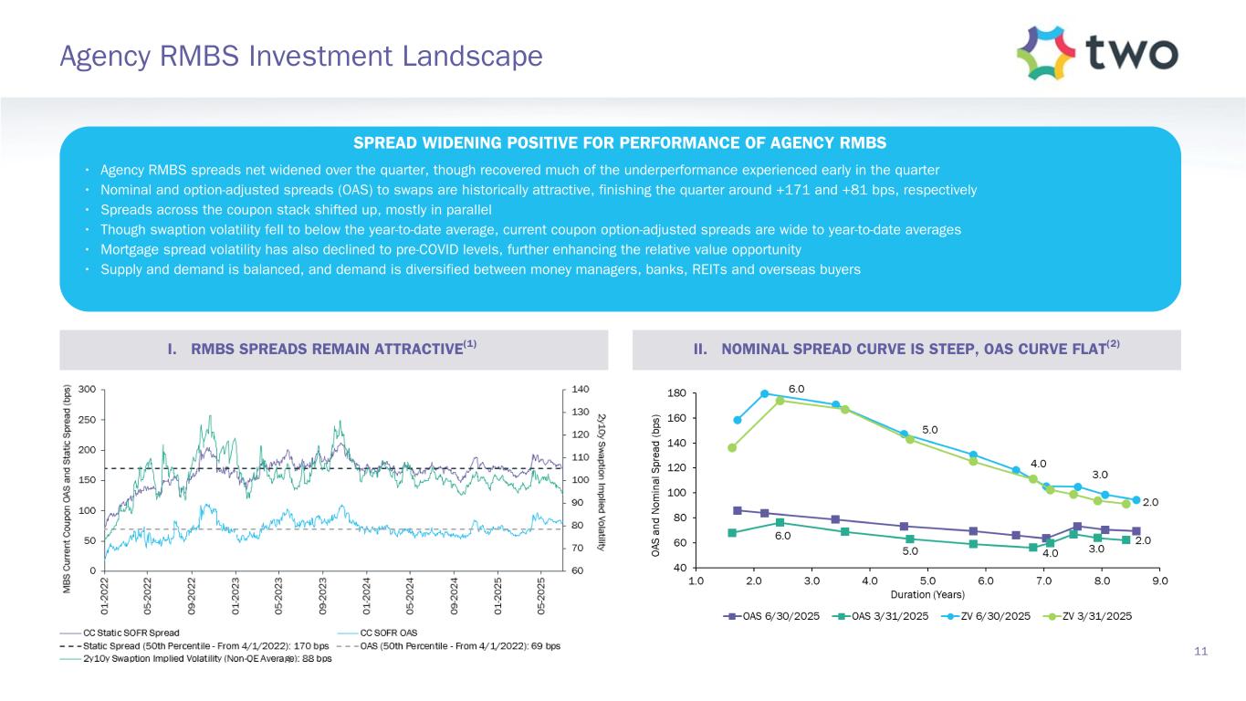 At June 30, 2025, $14.4 billion portfolio Includes $11.4 billion settled positions M ar ke t Va lu e Eq ui va le nt s ($ b ill io ns ) Econom ic D ebt-To-Equity 8.5 7.4 8.6 8.4 5.0 4.4 3.0 3.0 2.9 3.0 3.0 3.0 7.0x 6.5x 6.2x 7.0x Agency Net TBA Position MSR Economic Debt-to-Equity 9/30/2024 12/31/2024 3/31/2025 6/30/2025 0 5 10 15 20 25 30 0.0x 2.0x 4.0x 6.0x 8.0x (3) (3 ) (2) 14.414.6 16.4 14.8 Note: Sensitivity data as of June 30, 2025. The above scenarios are provided for illustration purposes only and are not necessarily indicative of TWO’s financial condition and operating results, nor are they necessarily indicative of the financial condition or results of operations that may be expected for any future period or date. See Slide 19 in the Appendix for more information on our risk positioning. C ha ng e in c om m on bo ok v al ue (0.6)% (0.6)% (0.8)% (0.7)% 3/31/2025 6/30/2025 Up 25 basis points Down 25 basis points (1.0)% (0.5)% —% C ha ng e in c om m on bo ok v al ue (4.9)% 4.1% (5.5)% 4.1% 3/31/2025 6/30/2025 Up 25 basis points Down 25 basis points (8.0)% —% 8.0% 10 Portfolio Composition and Risk Positioning I. PORTFOLIO COMPOSITION(1) II. INTEREST RATE EXPOSURE(4) III. MORTGAGE SPREAD EXPOSURE(5)