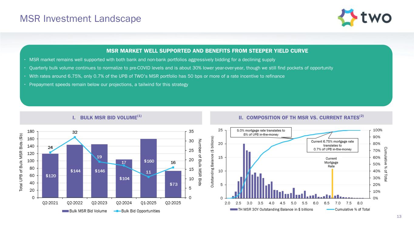 Coupon Ti ck s (3 2 nd s) TBAs TWO Specified Pools 2.0 2.5 3.0 3.5 4.0 4.5 5.0 5.5 6 6.5 -30 -20 -10 0 10 TWO Specified Pools (Q2-2025)TBAs (Q2-2025)(5) TBAs (Q1-2025)(5) TWO Specified Pools (Q1-2025) Market Value(4) ($ billions) $— $— $— $— $0.18 $1.66 $1.58 $1.30 $2.52 $0.43 12 Agency RMBS Portfolio I. RMBS QUARTERLY PERFORMANCE II. SPECIFIED POOL PREPAYMENT SPEEDS (2) (3) QUARTERLY HIGHLIGHTS • On aggregate, hedged performance for Agency RMBS was negative in the second quarter, with higher coupons outperforming lower coupons • 4.5% and 5.0% pools, where the majority of our holdings were concentrated throughout the second quarter, outperformed TBAs • Higher coupon TBAs benefited from some roll specialness, driven by outright demand as well as CMOs structured off these coupons to create floaters • On the margin, we shifted our exposure up in coupon, moving out of some positions of lower coupons into 6.0% coupons • Increased exposure to mortgage derivatives, positively contributing to performance • Weighted average specified pool portfolio prepayment speeds increased to 8.6%, compared to 7.4% in the first quarter(1), close to the increase in 30-year universe speeds