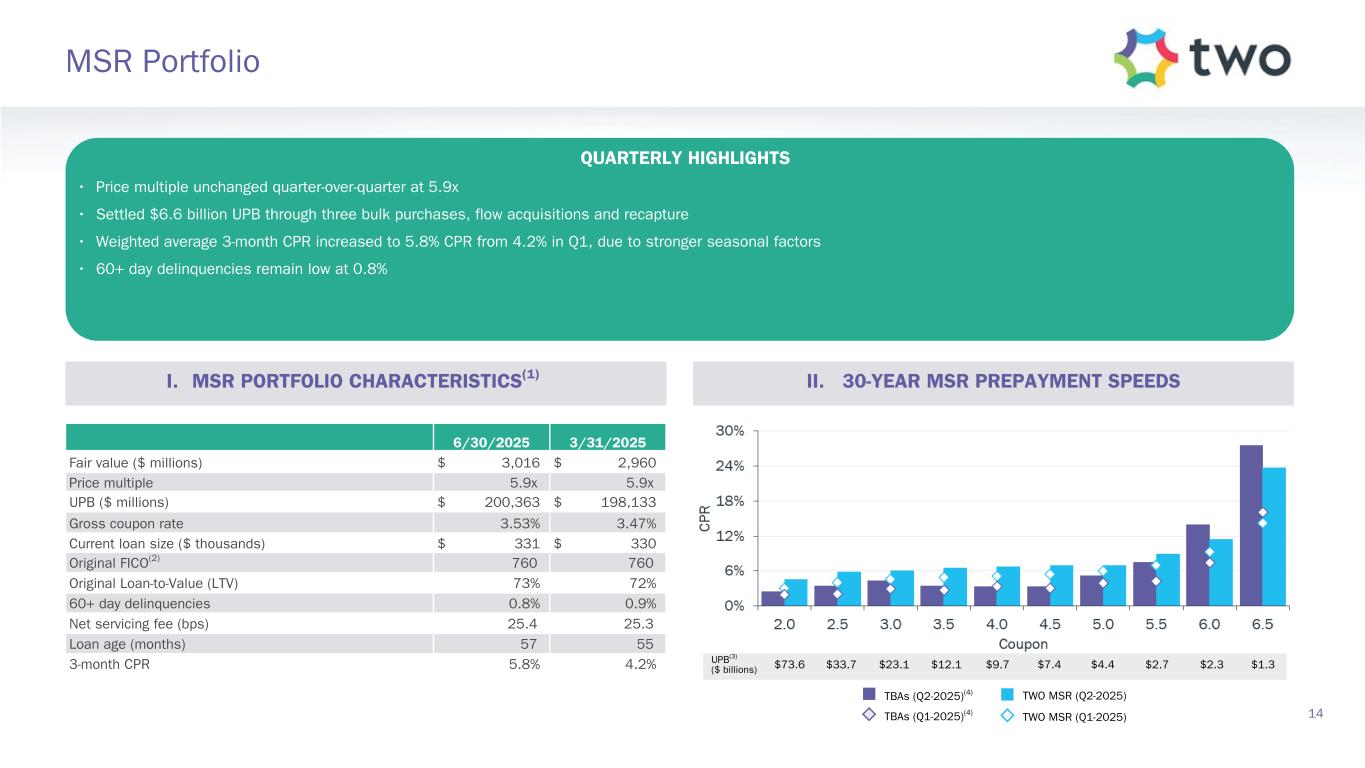 13 MSR Investment Landscape MSR MARKET WELL SUPPORTED AND BENEFITS FROM STEEPER YIELD CURVE • MSR market remains well supported with both bank and non-bank portfolios aggressively bidding for a declining supply • Quarterly bulk volume continues to normalize to pre-COVID levels and is about 30% lower year-over-year, though we still find pockets of opportunity • With rates around 6.75%, only 0.7% of the UPB of TWO's MSR portfolio has 50 bps or more of a rate incentive to refinance • Prepayment speeds remain below our projections, a tailwind for this strategy I. BULK MSR BID VOLUME(1) II. COMPOSITION OF TH MSR VS. CURRENT RATES(2)