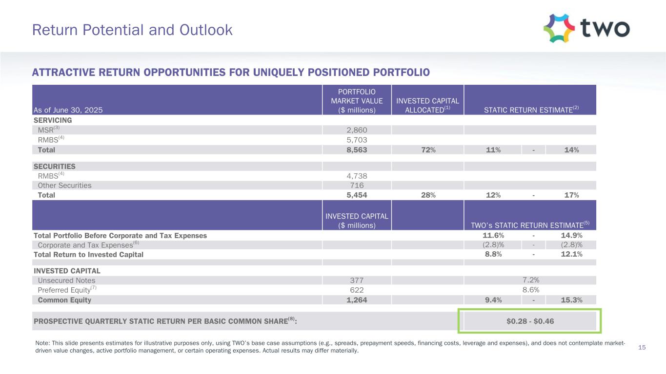 UPB(3) ($ billions) $73.6 $33.7 $23.1 $12.1 $9.7 $7.4 $4.4 $2.7 $2.3 $1.3 QUARTERLY HIGHLIGHTS • Price multiple unchanged quarter-over-quarter at 5.9x • Settled $6.6 billion UPB through three bulk purchases, flow acquisitions and recapture • Weighted average 3-month CPR increased to 5.8% CPR from 4.2% in Q1, due to stronger seasonal factors • 60+ day delinquencies remain low at 0.8% 6/30/2025 3/31/2025 Fair value ($ millions) $ 3,016 $ 2,960 Price multiple 5.9x 5.9x UPB ($ millions) $ 200,363 $ 198,133 Gross coupon rate 3.53 % 3.47 % Current loan size ($ thousands) $ 331 $ 330 Original FICO(2) 760 760 Original Loan-to-Value (LTV) 73 % 72 % 60+ day delinquencies 0.8 % 0.9 % Net servicing fee (bps) 25.4 25.3 Loan age (months) 57 55 3-month CPR 5.8 % 4.2 % TWO MSR (Q2-2025)TBAs (Q2-2025)(4) TBAs (Q1-2025)(4) TWO MSR (Q1-2025) 14 MSR Portfolio I. MSR PORTFOLIO CHARACTERISTICS(1) II. 30-YEAR MSR PREPAYMENT SPEEDS