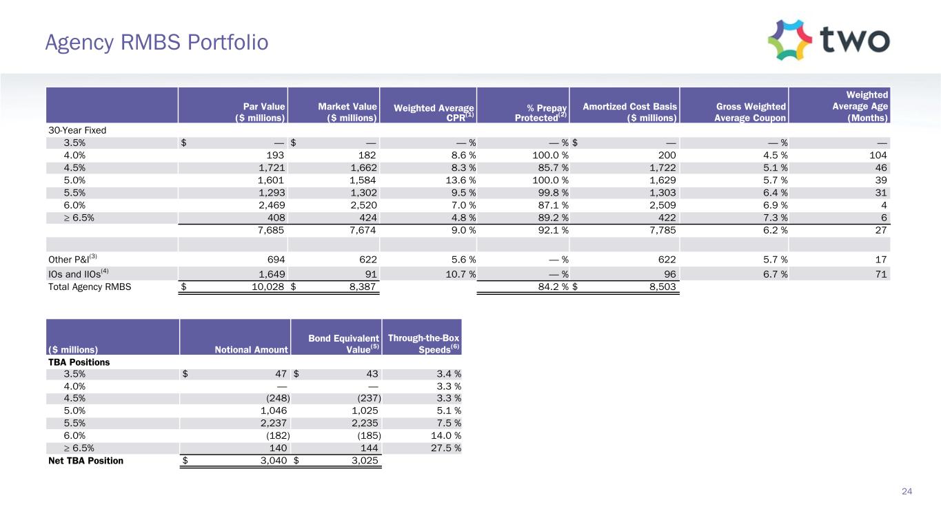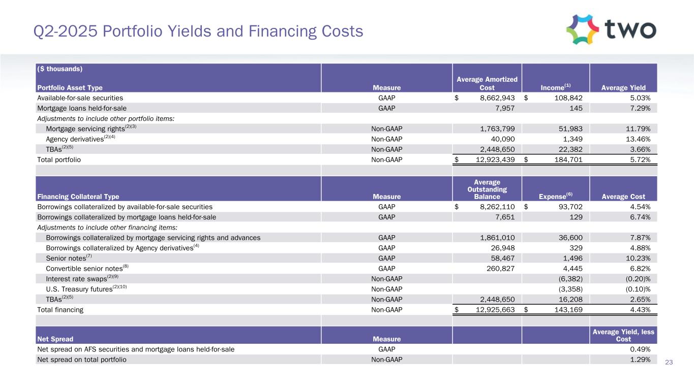($ thousands) Portfolio Asset Type Measure Average Amortized Cost Income(1) Average Yield Available-for-sale securities GAAP $ 8,662,943 $ 108,842 5.03% Mortgage loans held-for-sale GAAP 7,957 145 7.29% Adjustments to include other portfolio items: Mortgage servicing rights(2)(3) Non-GAAP 1,763,799 51,983 11.79% Agency derivatives(2)(4) Non-GAAP 40,090 1,349 13.46 % TBAs(2)(5) Non-GAAP 2,448,650 22,382 3.66 % Total portfolio Non-GAAP $ 12,923,439 $ 184,701 5.72% Financing Collateral Type Measure Average Outstanding Balance Expense(6) Average Cost Borrowings collateralized by available-for-sale securities GAAP $ 8,262,110 $ 93,702 4.54% Borrowings collateralized by mortgage loans held-for-sale GAAP 7,651 129 6.74 % Adjustments to include other financing items: Borrowings collateralized by mortgage servicing rights and advances GAAP 1,861,010 36,600 7.87 % Borrowings collateralized by Agency derivatives(4) GAAP 26,948 329 4.88 % Senior notes(7) GAAP 58,467 1,496 10.23 % Convertible senior notes(8) GAAP 260,827 4,445 6.82 % Interest rate swaps(2)(9) Non-GAAP (6,382) (0.20) % U.S. Treasury futures(2)(10) Non-GAAP (3,358) (0.10) % TBAs(2)(5) Non-GAAP 2,448,650 16,208 2.65 % Total financing Non-GAAP $ 12,925,663 $ 143,169 4.43 % Net Spread Measure Average Yield, less Cost Net spread on AFS securities and mortgage loans held-for-sale GAAP 0.49% Net spread on total portfolio Non-GAAP 1.29% 23 Q2-2025 Portfolio Yields and Financing Costs