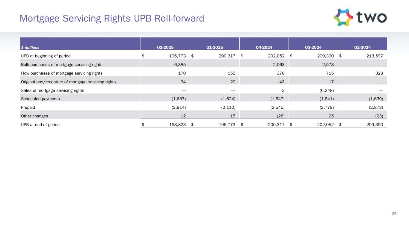 $ millions Q2-2025 Q1-2025 Q4-2024 Q3-2024 Q2-2024 UPB at beginning of period $ 196,773 $ 200,317 $ 202,052 $ 209,390 $ 213,597 Bulk purchases of mortgage servicing rights 6,385 — 2,063 2,573 — Flow purchases of mortgage servicing rights 170 155 376 715 328 Originations/recapture of mortgage servicing rights 34 20 43 17 — Sales of mortgage servicing rights — — 3 (6,248) — Scheduled payments (1,637) (1,624) (1,647) (1,641) (1,639) Prepaid (2,914) (2,110) (2,545) (2,779) (2,873) Other changes 12 15 (28) 25 (23) UPB at end of period $ 198,823 $ 196,773 $ 200,317 $ 202,052 $ 209,390 26 Mortgage Servicing Rights UPB Roll-forward