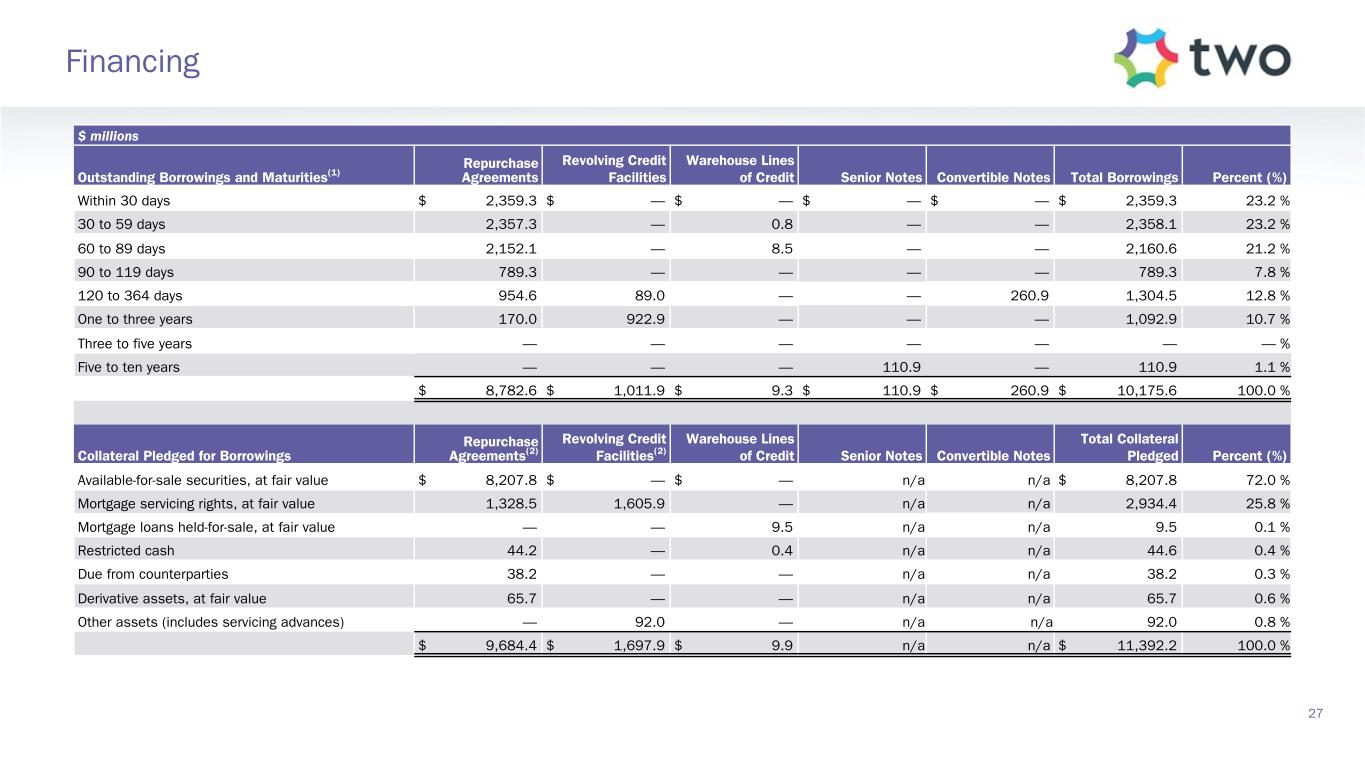$ millions Outstanding Borrowings and Maturities(1) Repurchase Agreements Revolving Credit Facilities Warehouse Lines of Credit Senior Notes Convertible Notes Total Borrowings Percent (%) Within 30 days $ 2,359.3 $ — $ — $ — $ — $ 2,359.3 23.2 % 30 to 59 days 2,357.3 — 0.8 — — 2,358.1 23.2 % 60 to 89 days 2,152.1 — 8.5 — — 2,160.6 21.2 % 90 to 119 days 789.3 — — — — 789.3 7.8 % 120 to 364 days 954.6 89.0 — — 260.9 1,304.5 12.8 % One to three years 170.0 922.9 — — — 1,092.9 10.7 % Three to five years — — — — — — — % Five to ten years — — — 110.9 — 110.9 1.1 % $ 8,782.6 $ 1,011.9 $ 9.3 $ 110.9 $ 260.9 $ 10,175.6 100.0 % Collateral Pledged for Borrowings Repurchase Agreements(2) Revolving Credit Facilities(2) Warehouse Lines of Credit Senior Notes Convertible Notes Total Collateral Pledged Percent (%) Available-for-sale securities, at fair value $ 8,207.8 $ — $ — n/a n/a $ 8,207.8 72.0 % Mortgage servicing rights, at fair value 1,328.5 1,605.9 — n/a n/a 2,934.4 25.8 % Mortgage loans held-for-sale, at fair value — — 9.5 n/a n/a 9.5 0.1 % Restricted cash 44.2 — 0.4 n/a n/a 44.6 0.4 % Due from counterparties 38.2 — — n/a n/a 38.2 0.3 % Derivative assets, at fair value 65.7 — — n/a n/a 65.7 0.6 % Other assets (includes servicing advances) — 92.0 — n/a n/a 92.0 0.8 % $ 9,684.4 $ 1,697.9 $ 9.9 n/a n/a $ 11,392.2 100.0 % 27 Financing