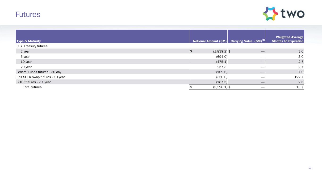 Type & Maturity Notional Amount ($M) Carrying Value ($M)(1) Weighted Average Months to Expiration U.S. Treasury futures 2 year $ (1,839.2) $ — 3.0 5 year (694.0) — 3.0 10 year (475.1) — 2.7 20 year 257.3 — 2.7 Federal Funds futures - 30 day (109.6) — 7.0 Eris SOFR swap futures - 10 year (350.0) — 122.7 SOFR futures - < 1 year (187.5) — 2.6 Total futures $ (3,398.1) $ — 13.7 28 Futures