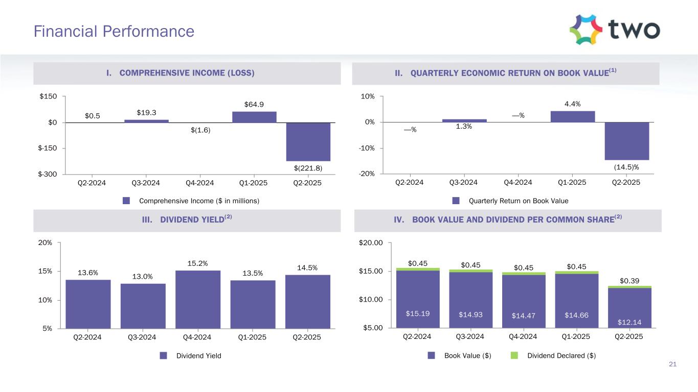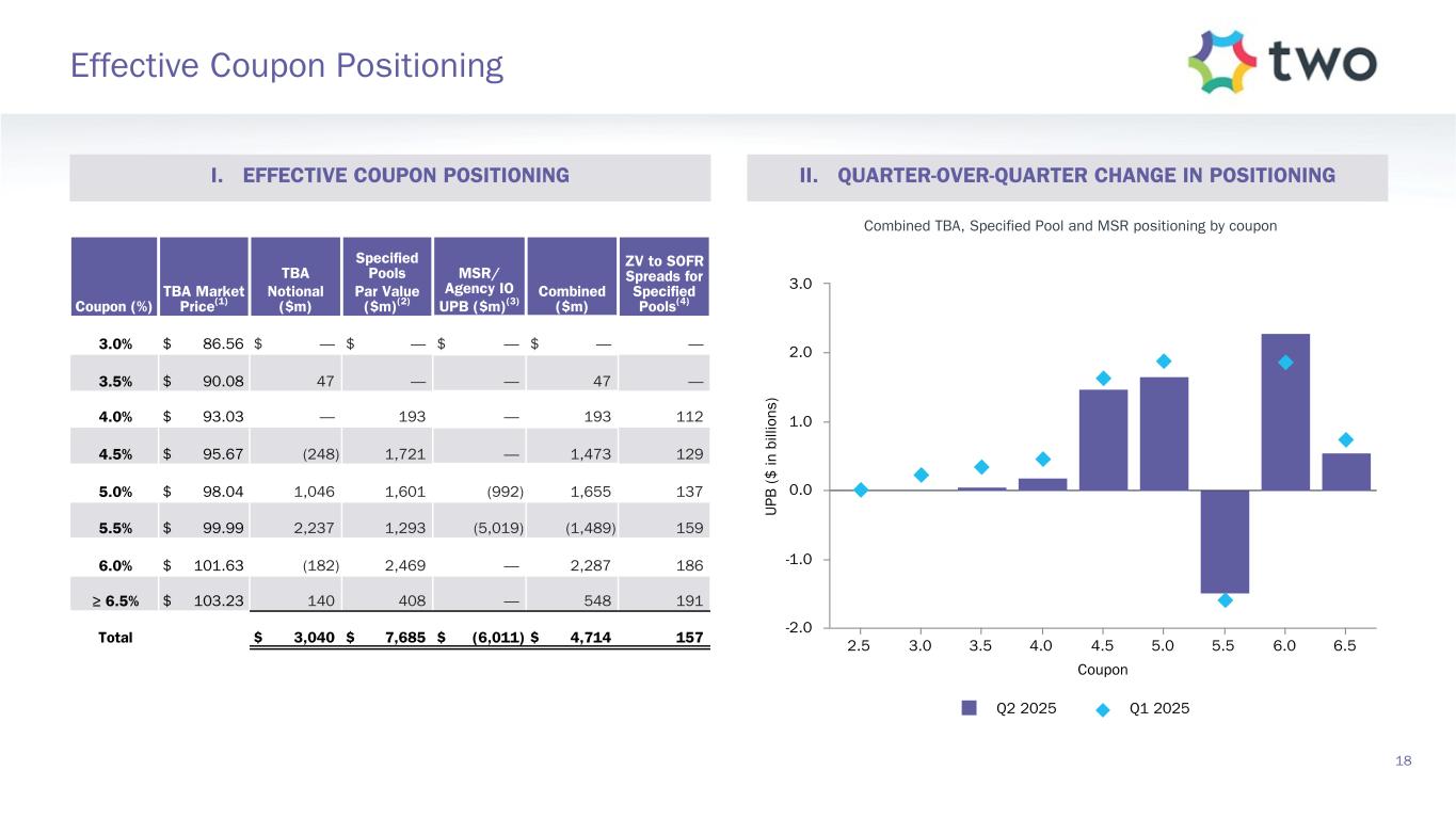 Note: Sensitivity data as of June 30, 2025. The above scenarios are provided for illustration purposes only and are not necessarily indicative of TWO’s financial condition and operating results, nor are they necessarily indicative of the financial condition or results of operations that may be expected for any future period or date. Book Value Exposure to Changes in Rates % Change in Common Book Value 2-Year Rate (basis points) 10-Year Rate (basis points) Agency P&I RMBS/TBA MSR/Agency IO RMBS(1) Other(2) Combined -25 0 Bull Steepener(3) 2.8 % 0.8 % (3.1) % 0.5 % 0 -25 Bull Flattener(4) 6.0 % (4.4) % (2.8) % (1.2) % -50 -50 Parallel Shift(5) 16.7 % (7.9) % (12.0) % (3.2) % -25 -25 Parallel Shift(5) 8.8 % (3.6) % (5.9) % (0.7) % 0 0 Base — % — % — % — % +25 +25 Parallel Shift(5) (9.7) % 3.2 % 5.8 % (0.8) % +50 +50 Parallel Shift(5) (20.2) % 5.8 % 11.3 % (3.1) % +25 0 Bear Flattener(3) (2.7) % (1.0) % 2.9 % (0.8) % 0 +25 Bear Steepener(4) (7.0) % 4.2 % 2.8 % — % Book Value Exposure to Current Coupon Spread(6) % Change in Common Book Value Parallel Shift in Spreads (basis points) Agency P&I RMBS/TBA MSR/Agency IO RMBS(1) Combined -25 8.4 % (4.3) % 4.1 % 0 — % — % — % +25 (9.4) % 3.9 % (5.5) % 19 Risk Positioning